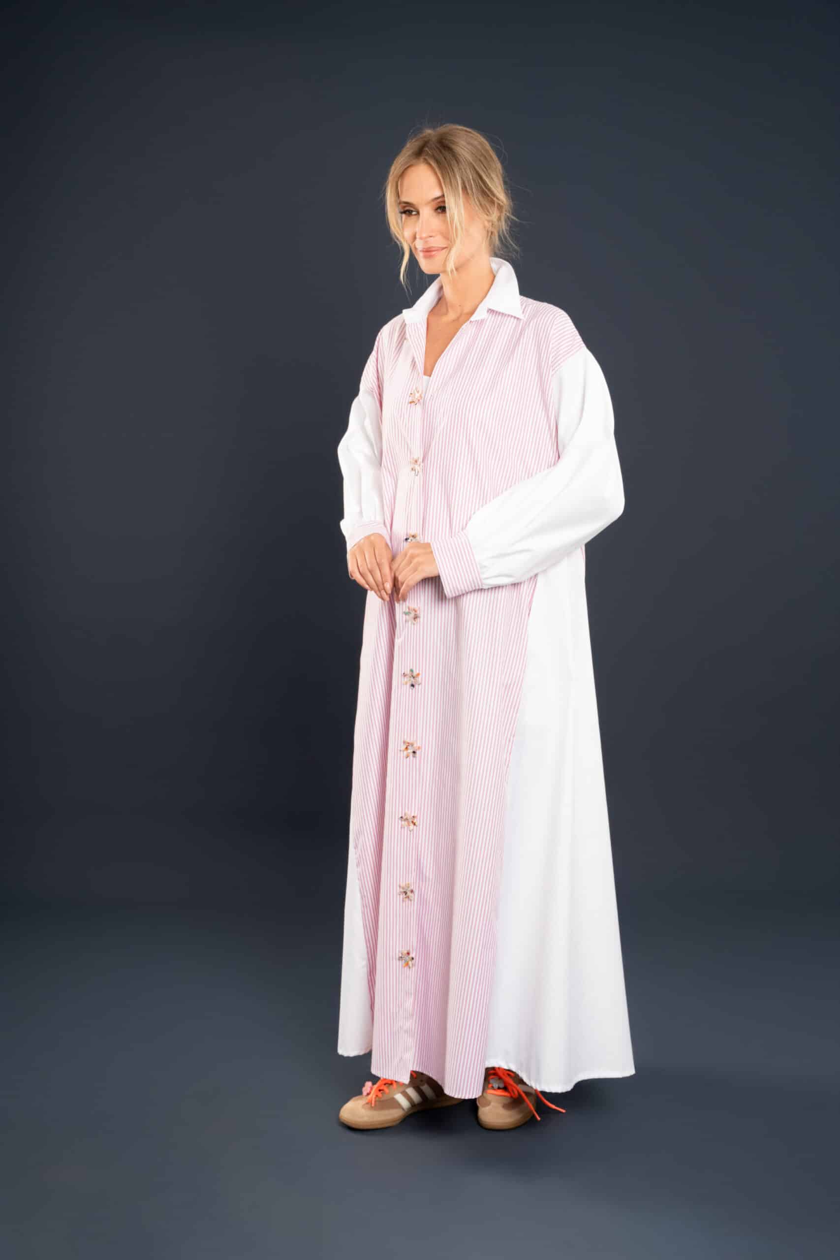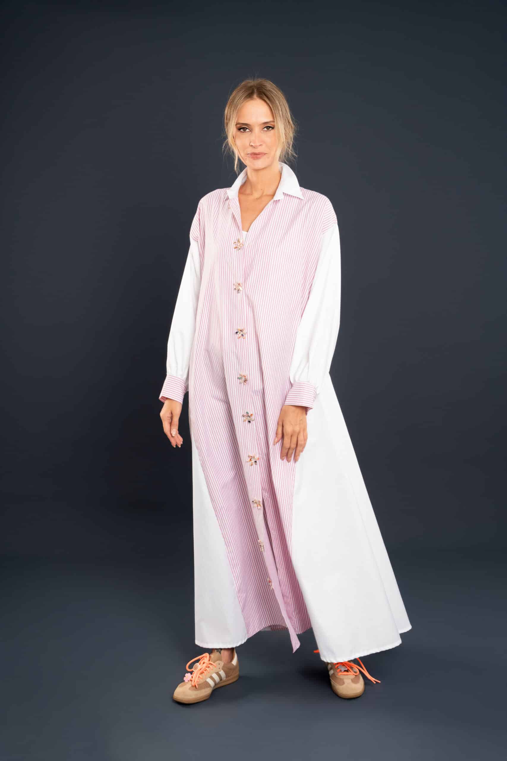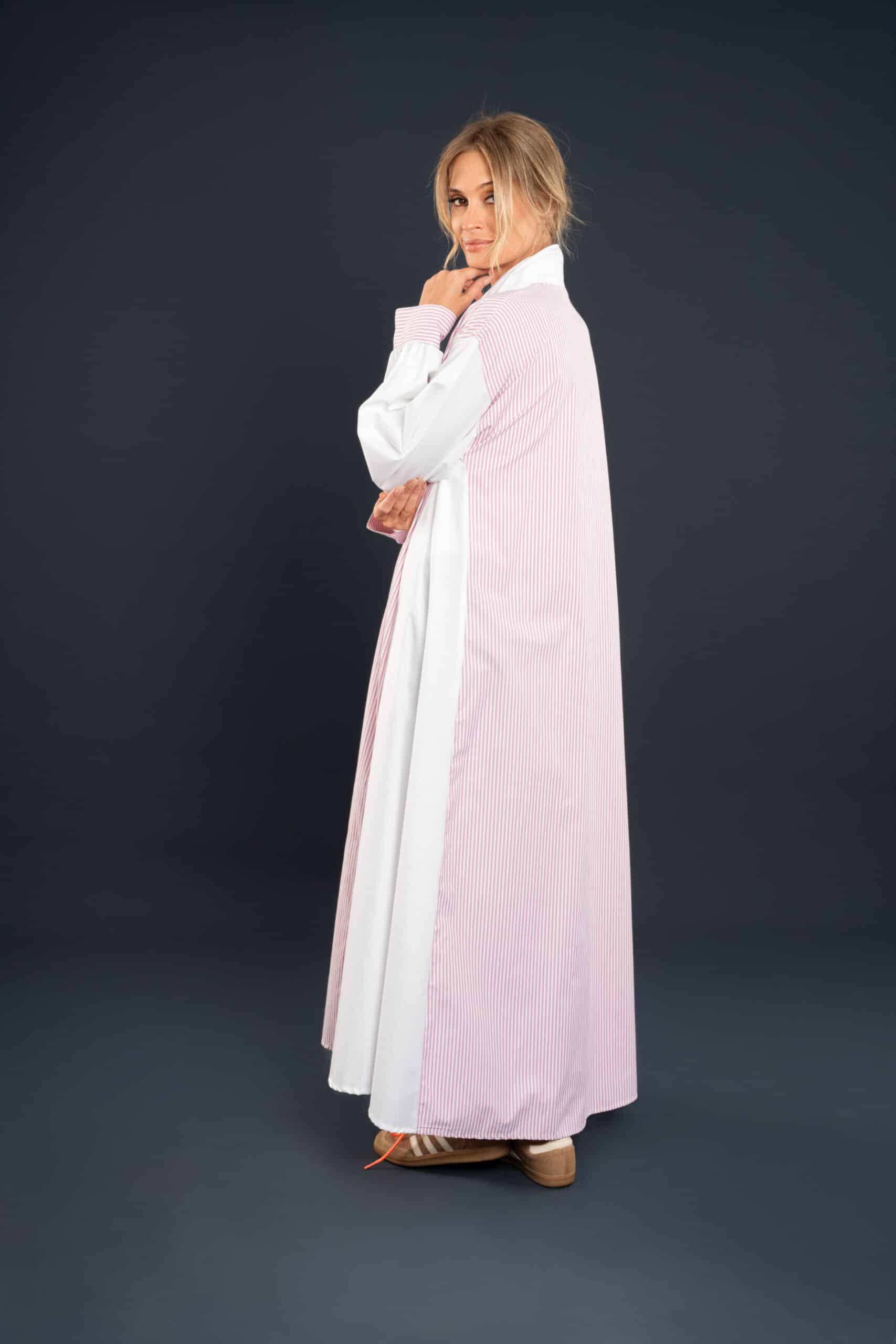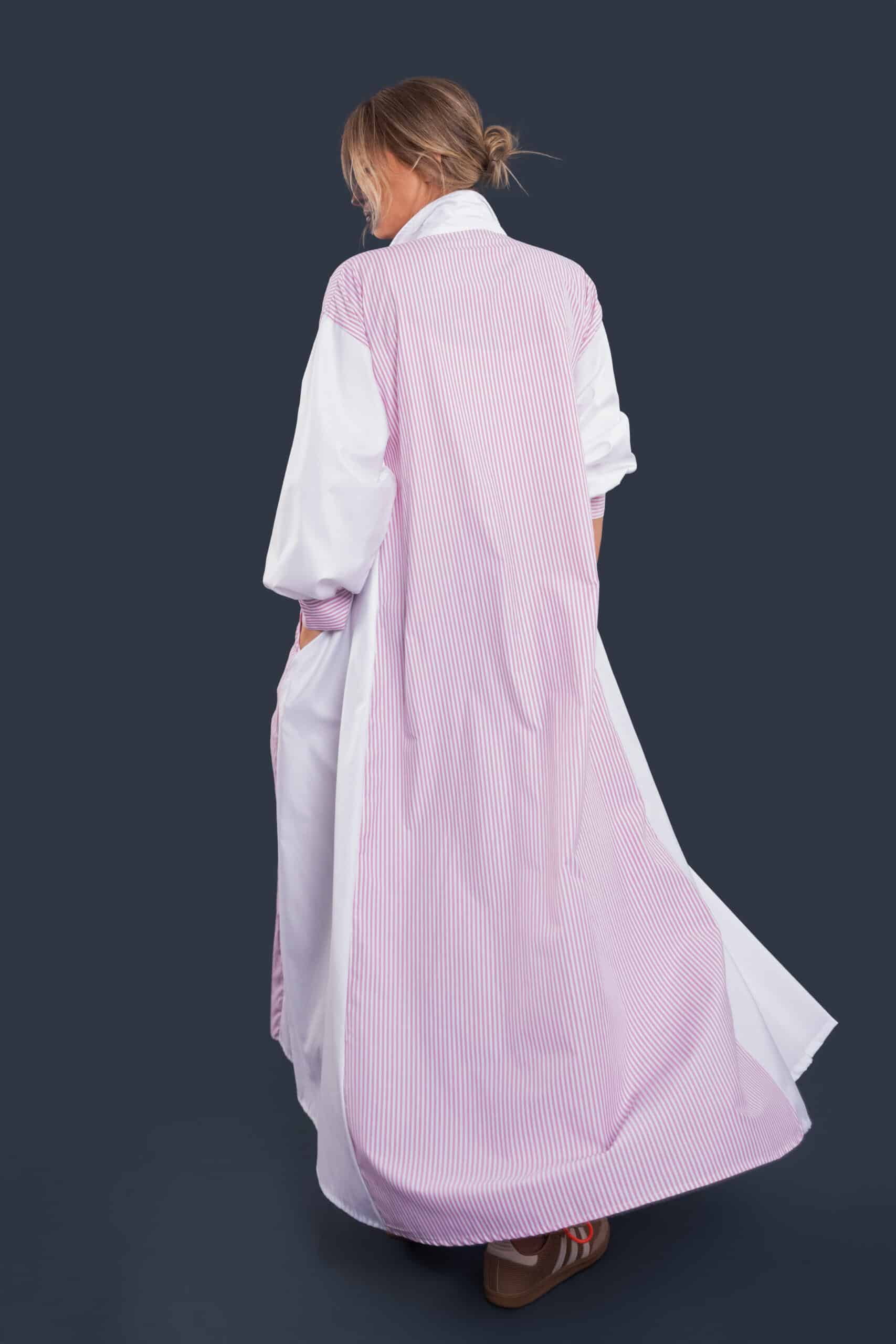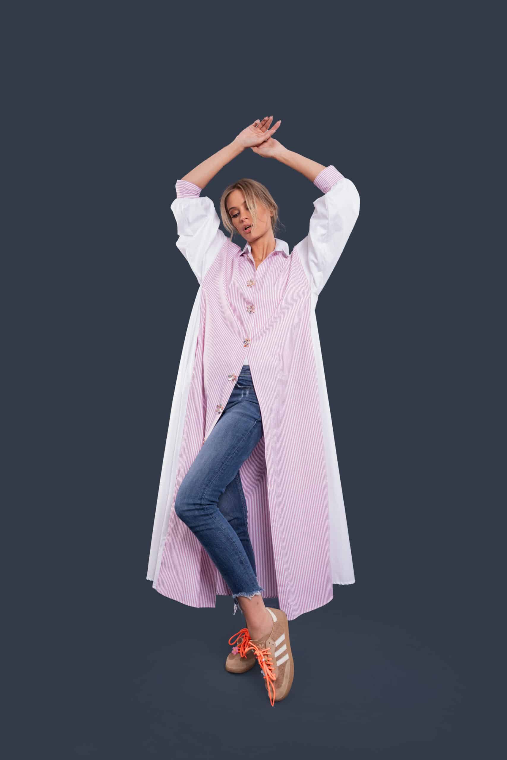 Its lightweight texture and relaxed fit make it the perfect go-to for breezy days, while the structured stripes add a touch of timeless sophistication.