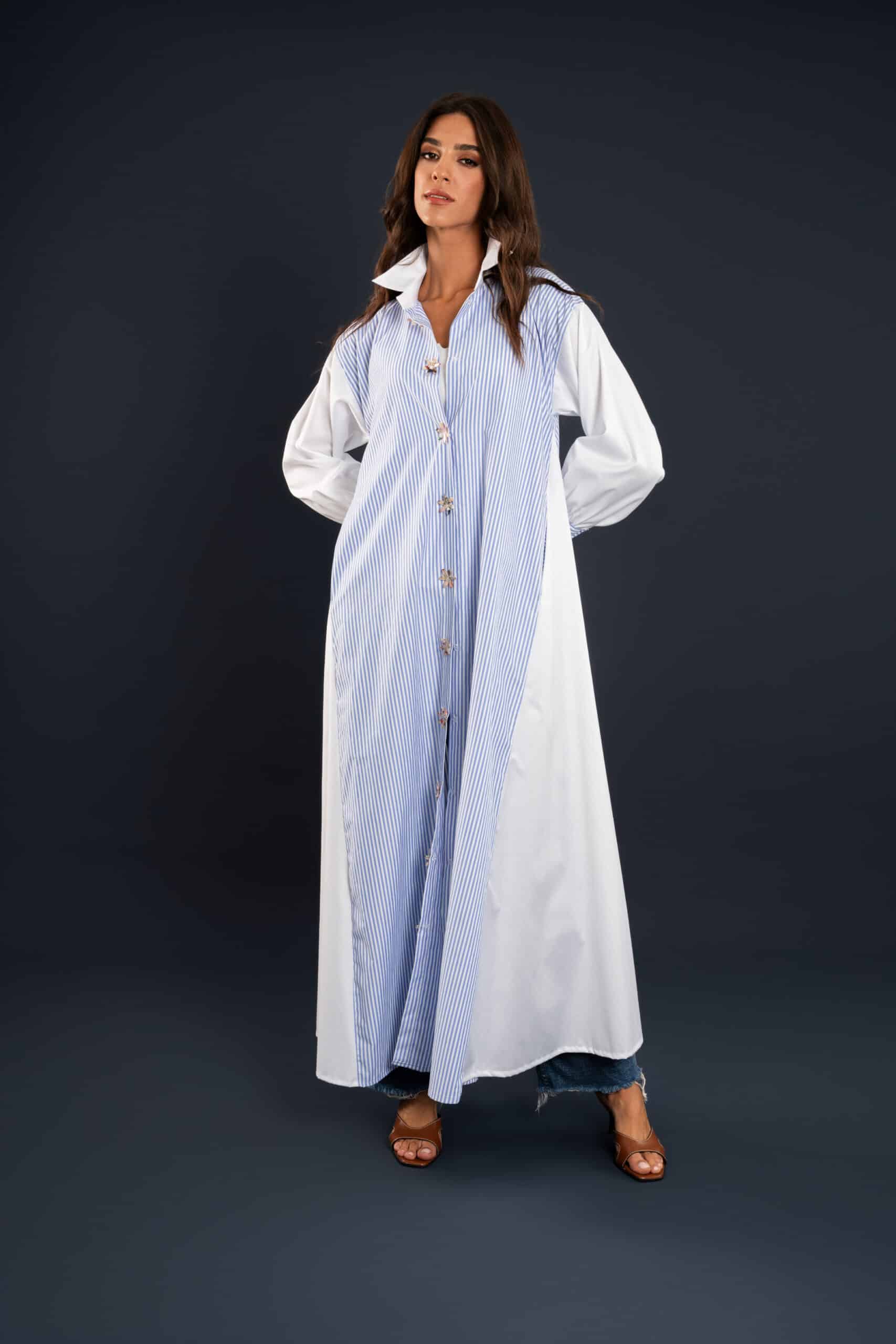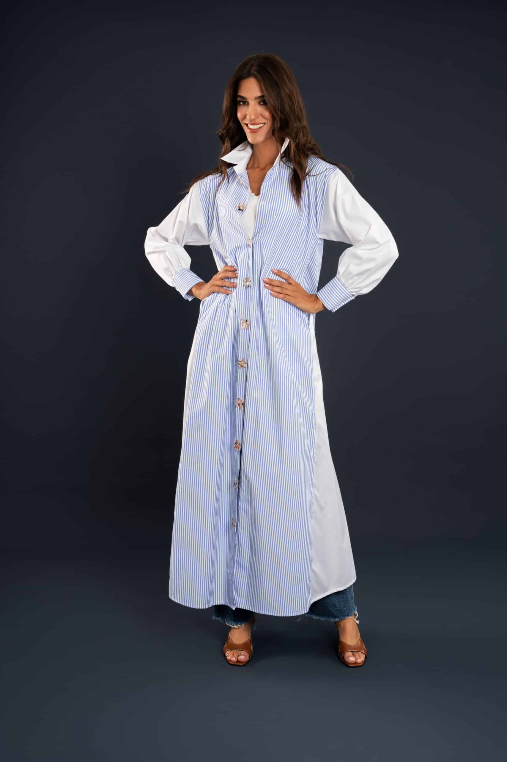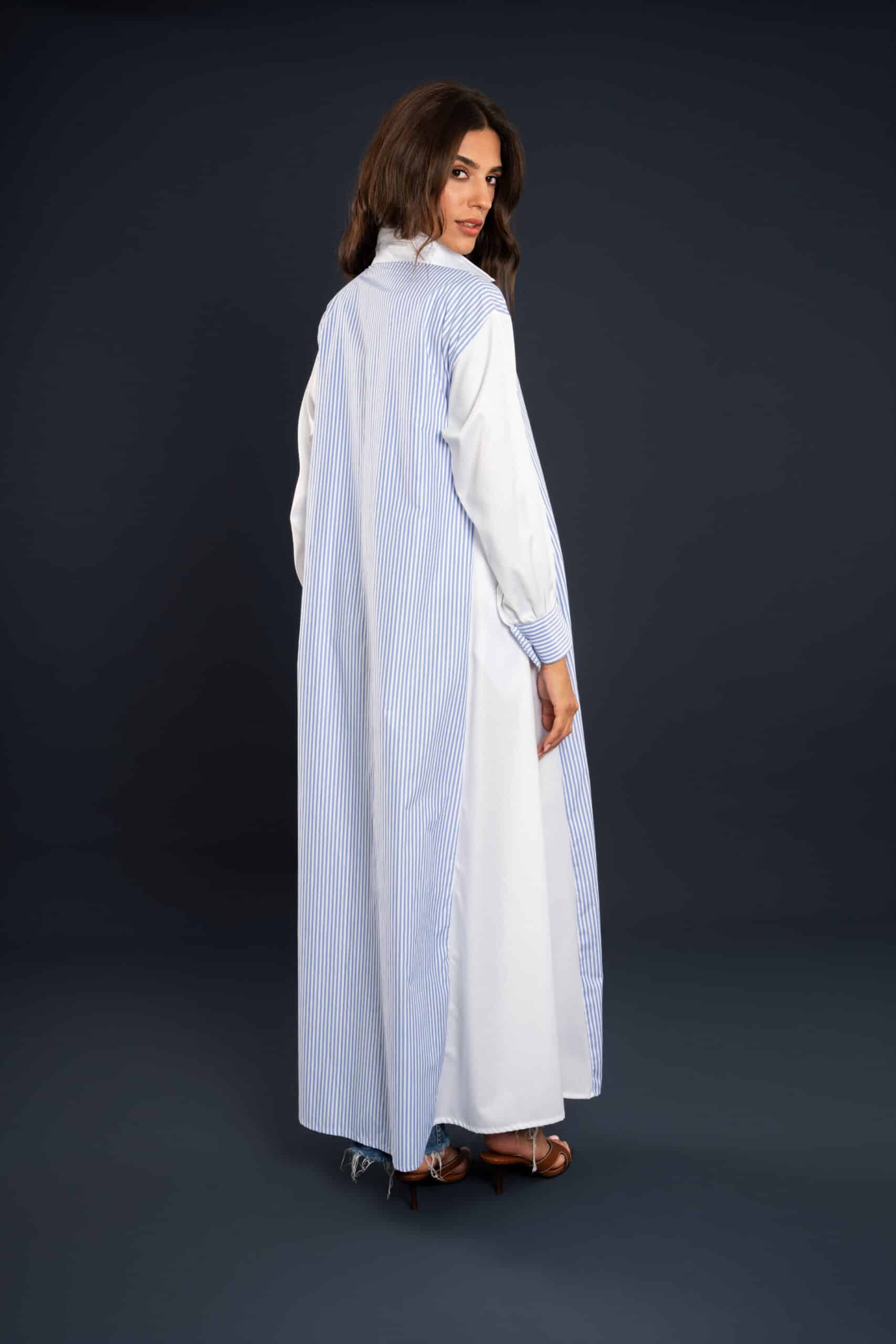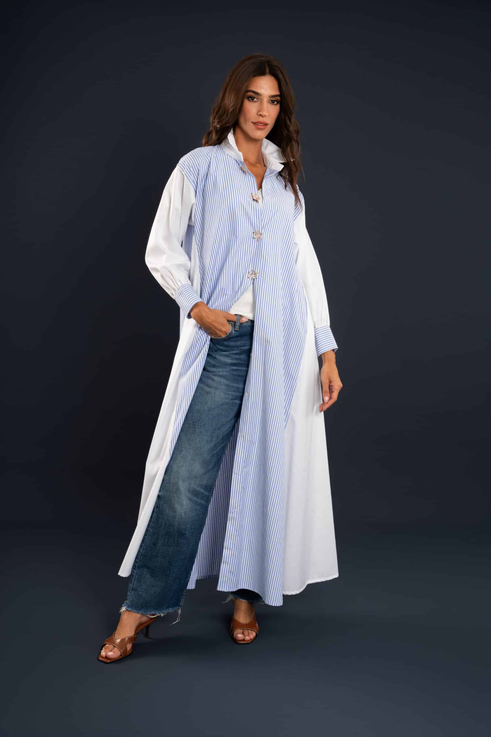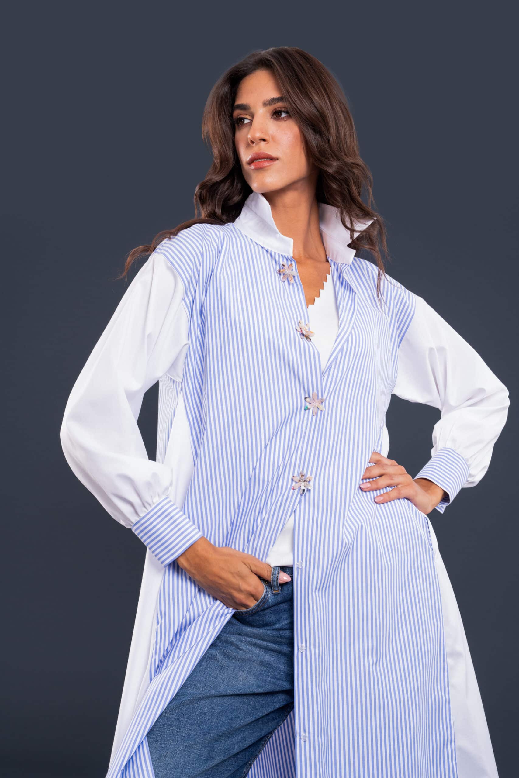 Its lightweight texture and relaxed fit make it the perfect go-to for breezy days, while the structured stripes add a touch of timeless sophistication.