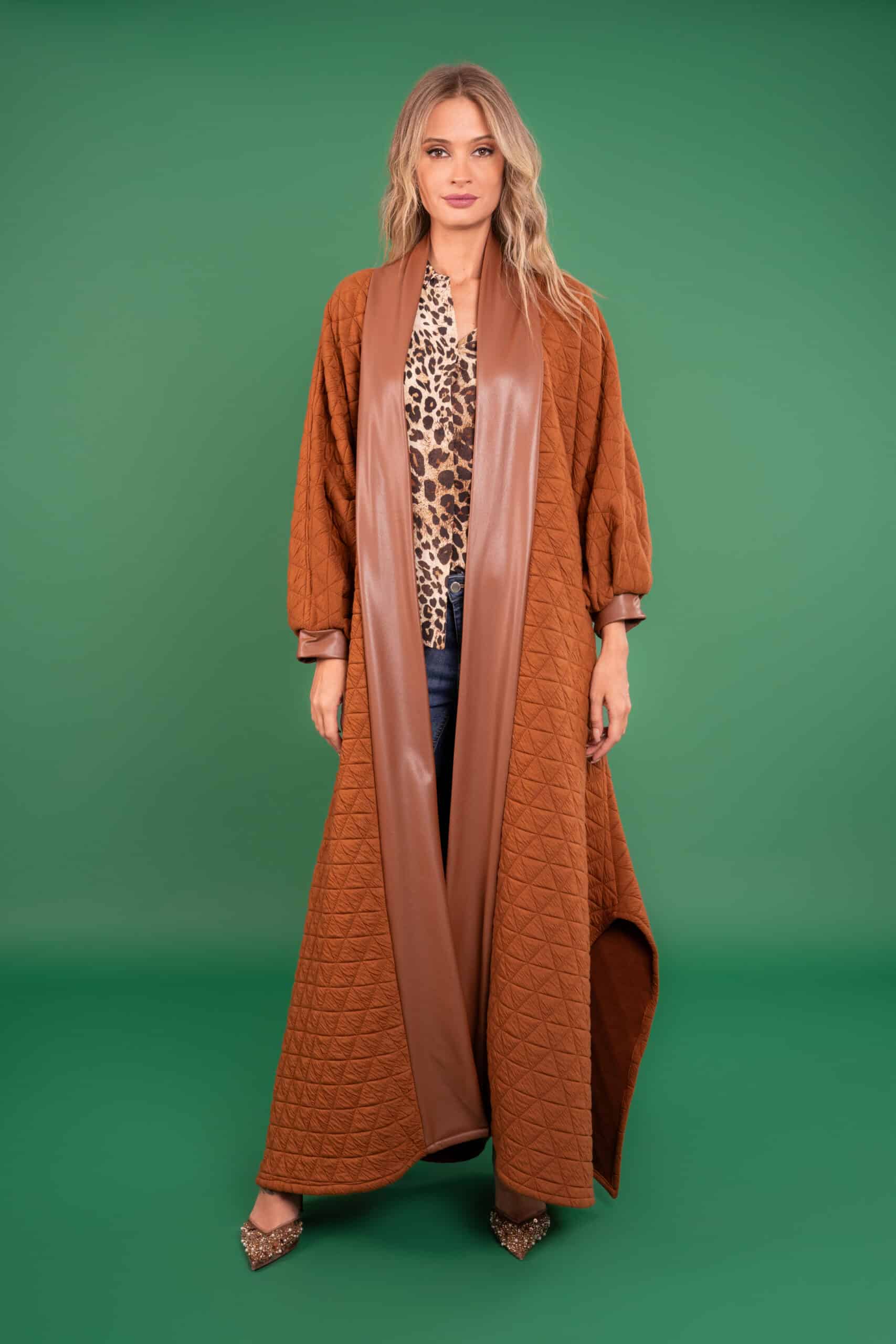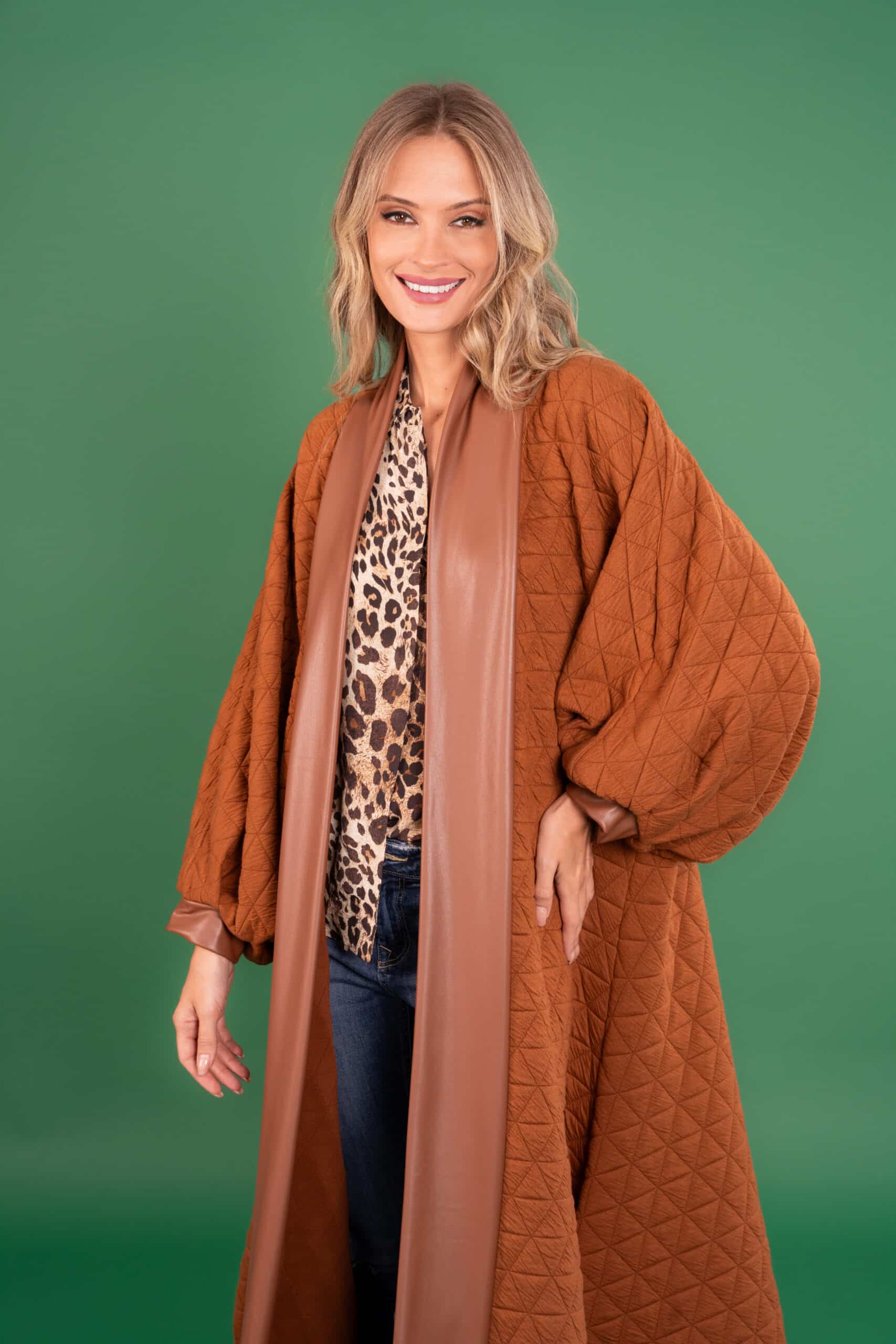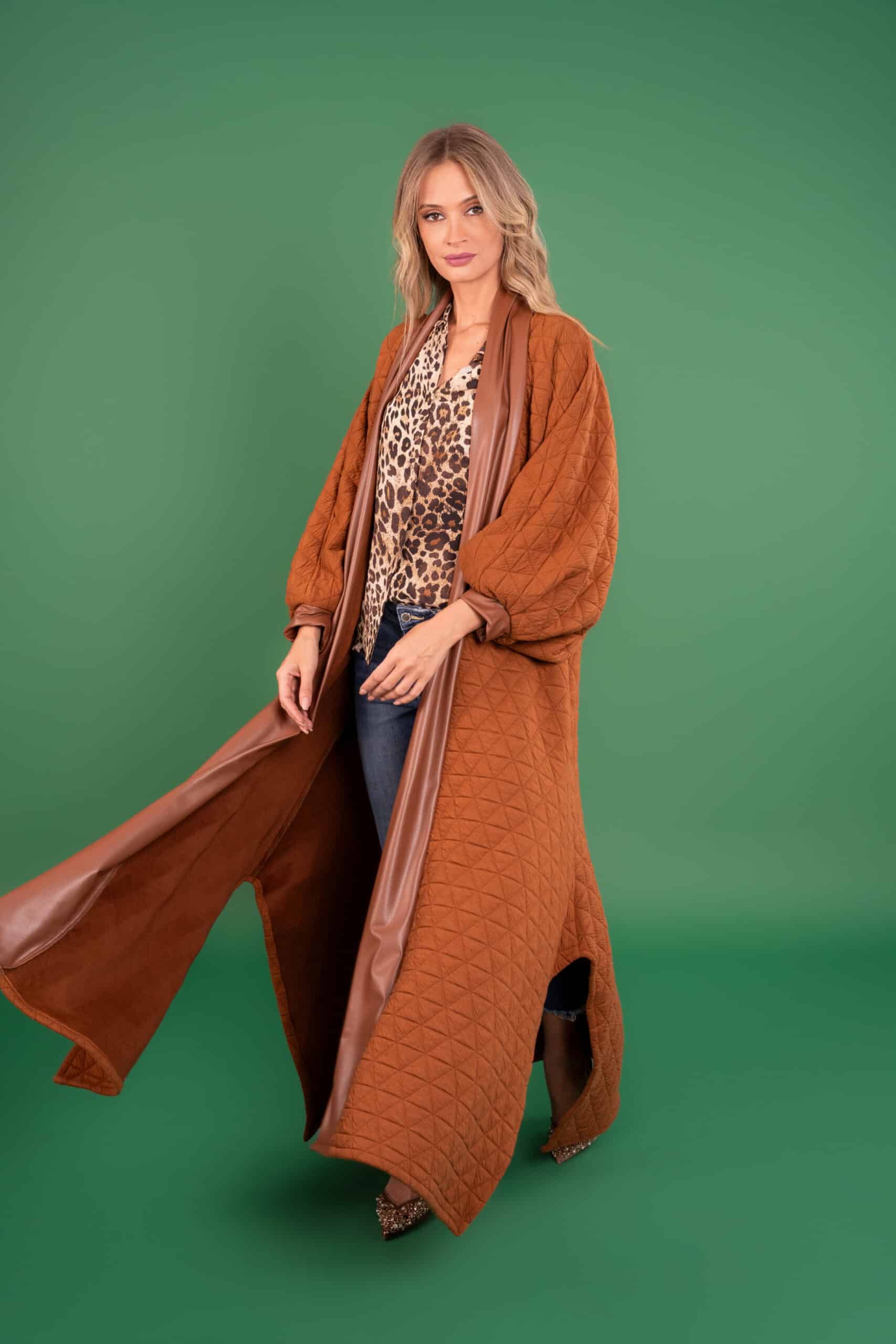 Faded Texture: A bold cotton coat in deep camel, sharpened with a leather-collar edge.