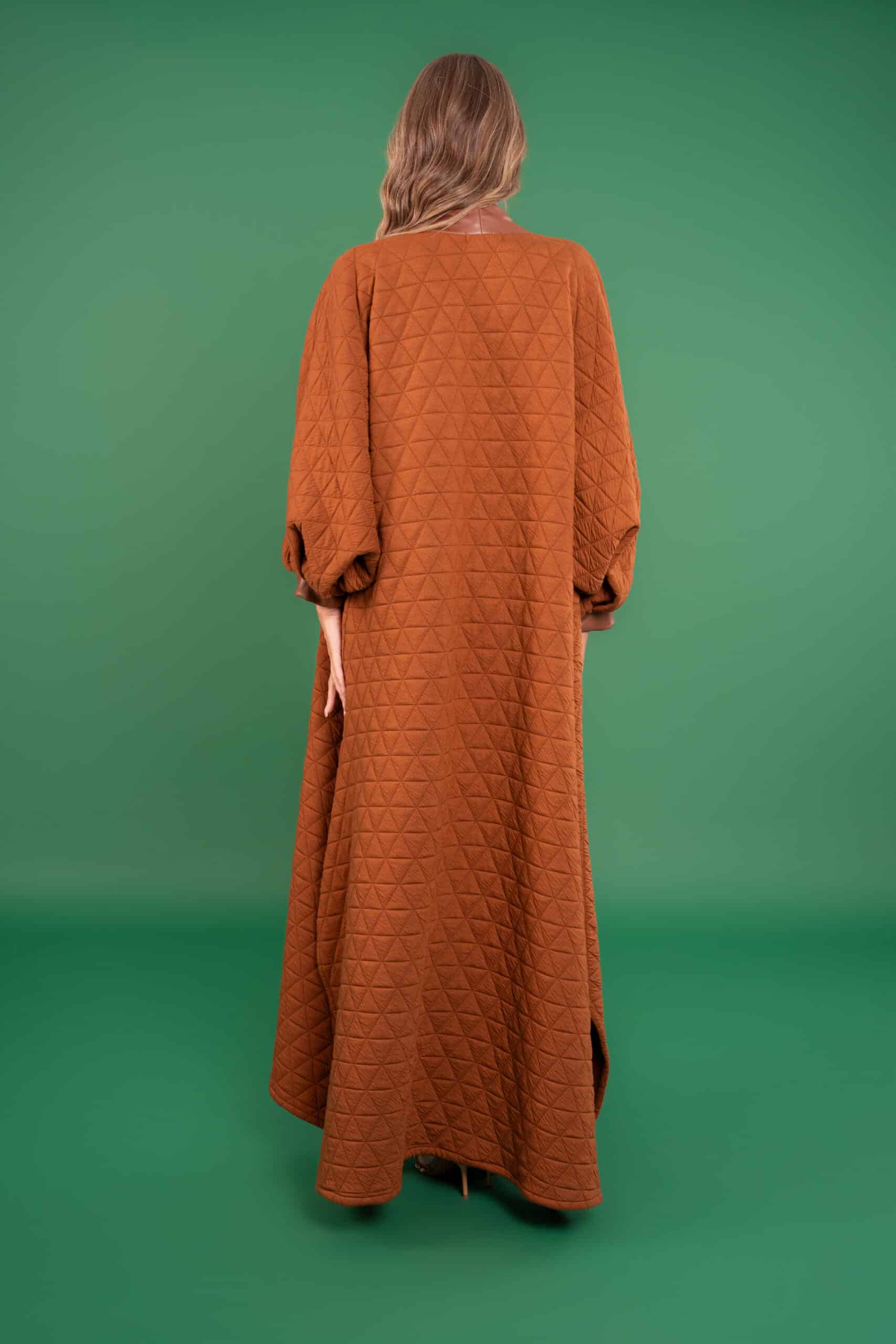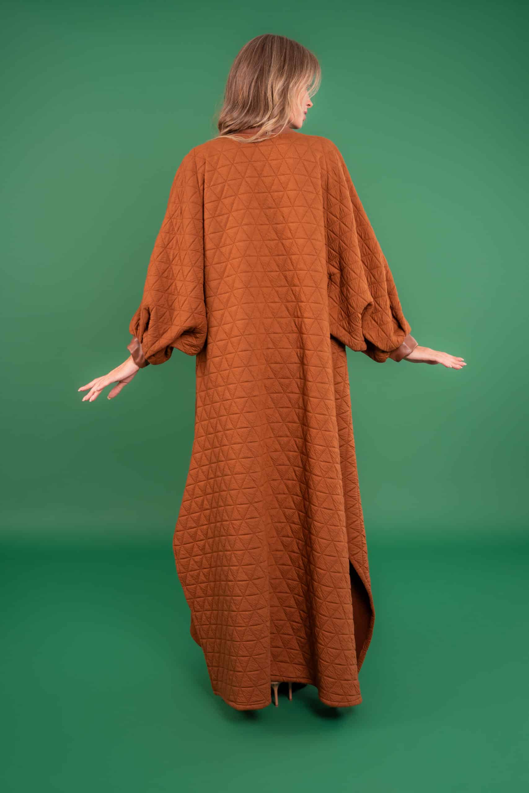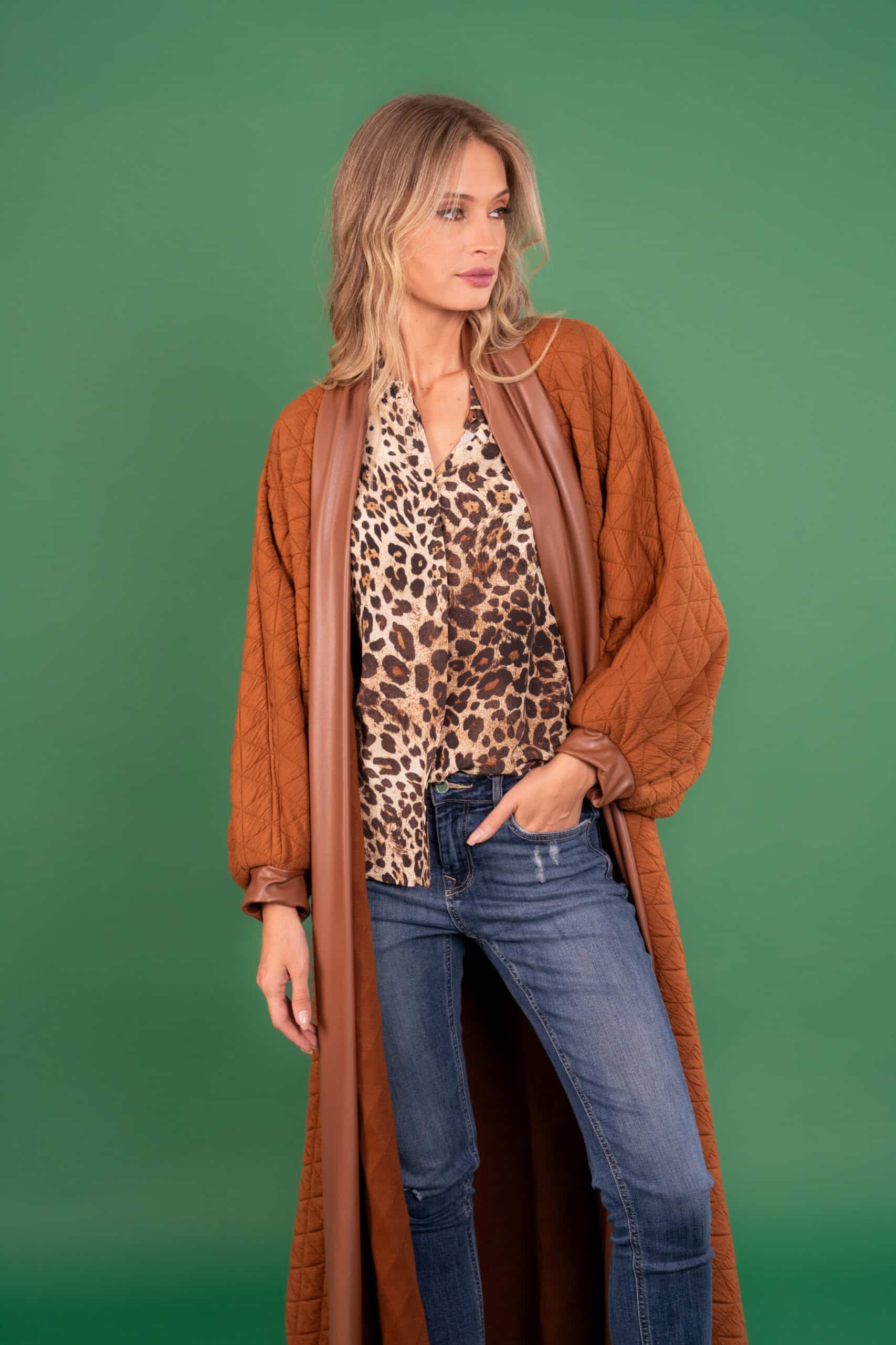 Faded Texture: A bold cotton coat in deep camel, sharpened with a leather-collar edge.
