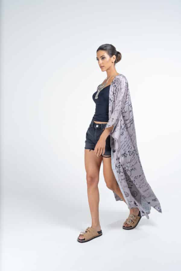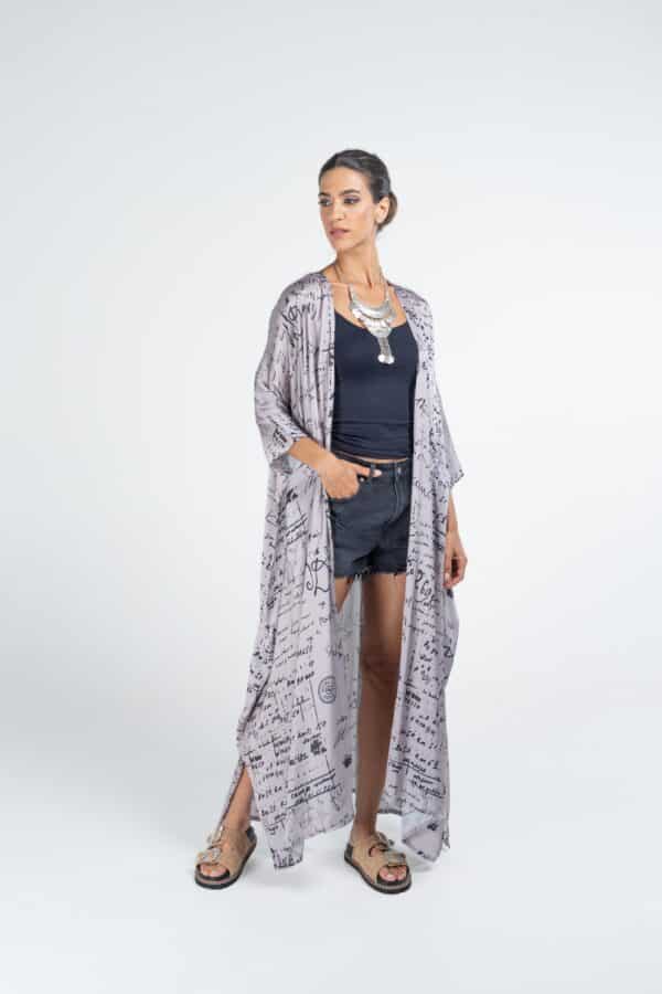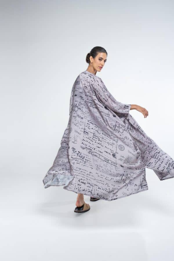 Crafted from flowing satin and featuring a unique typography element, it’s a statement piece with a refined touch.