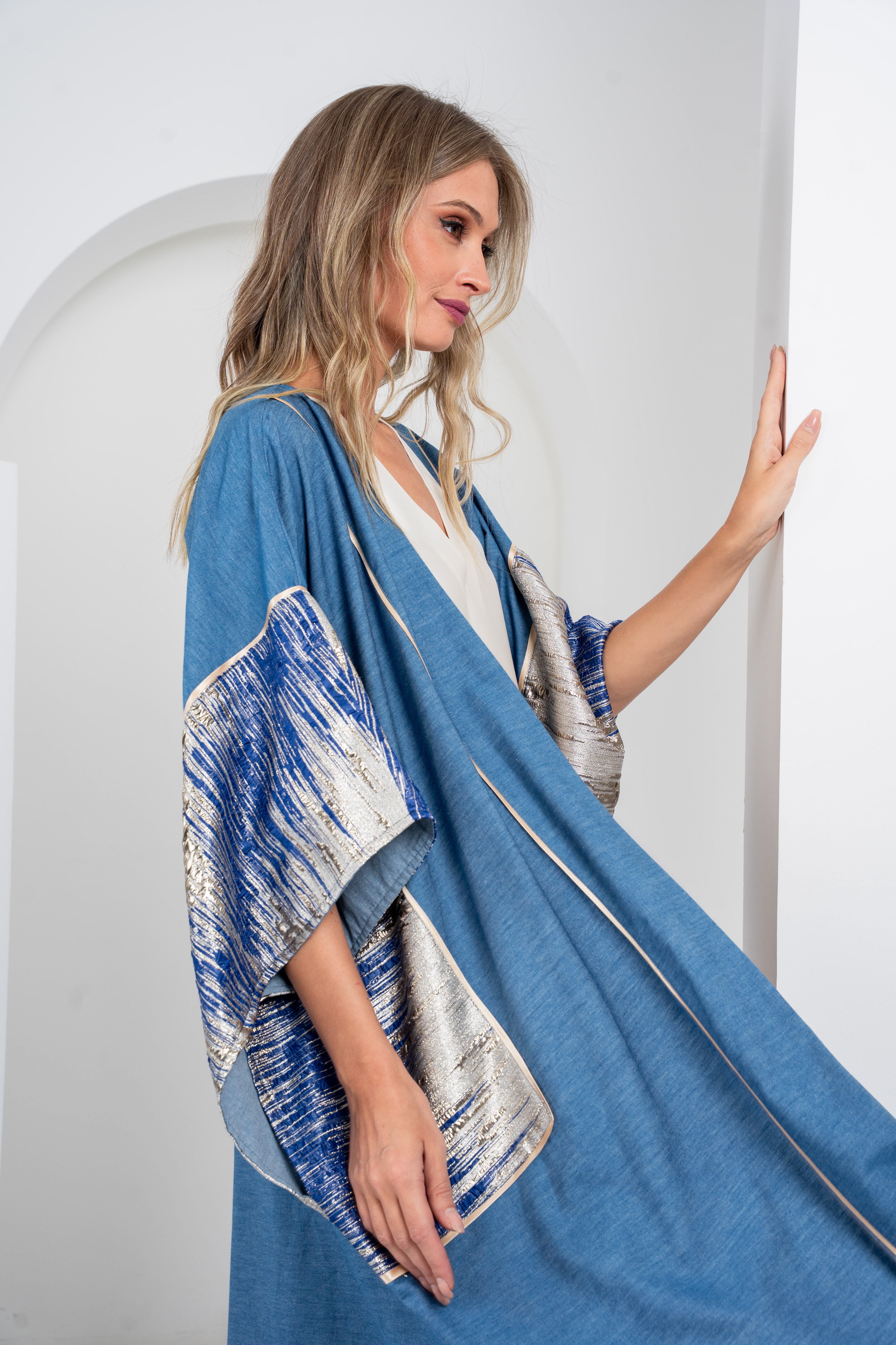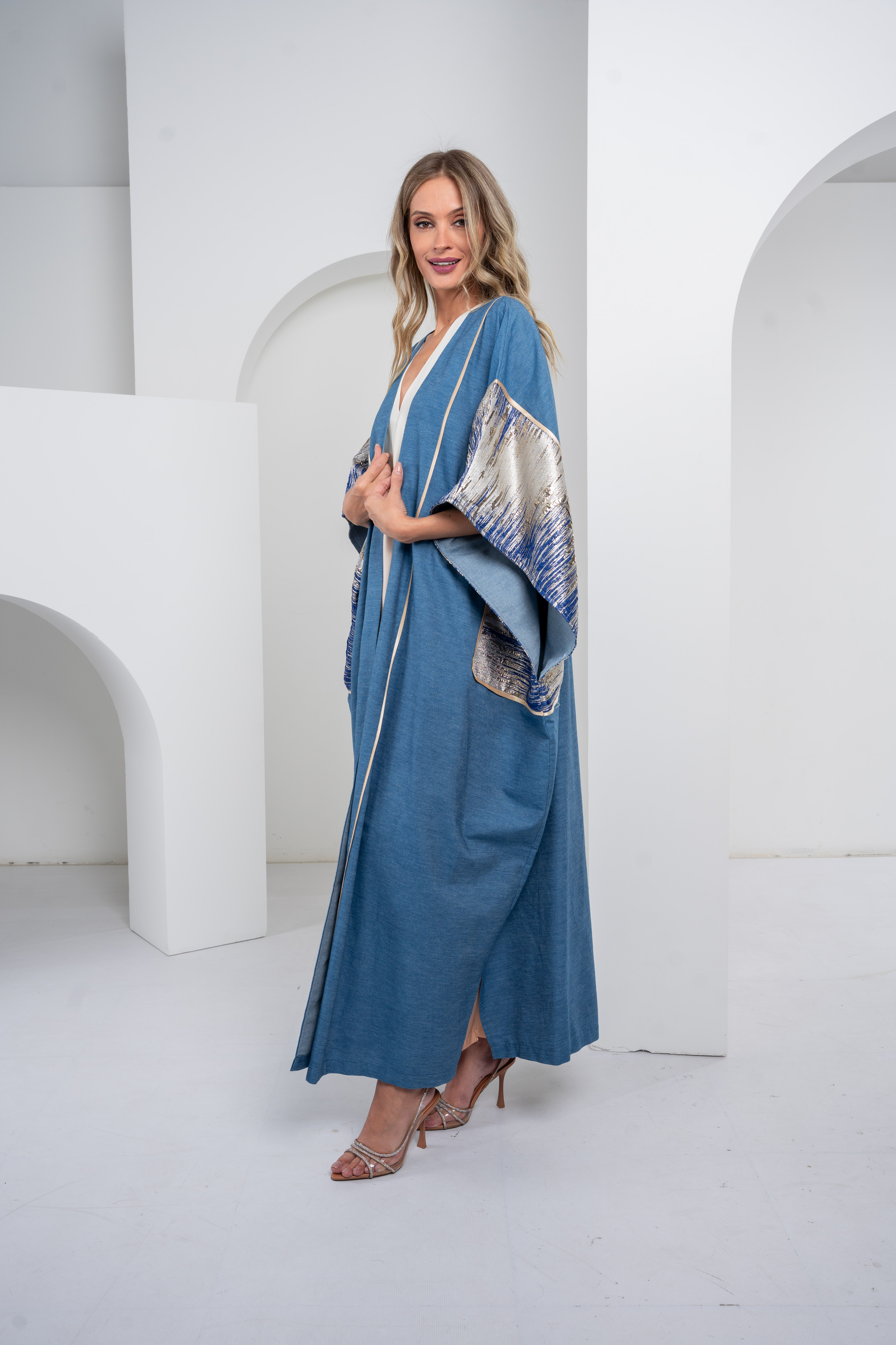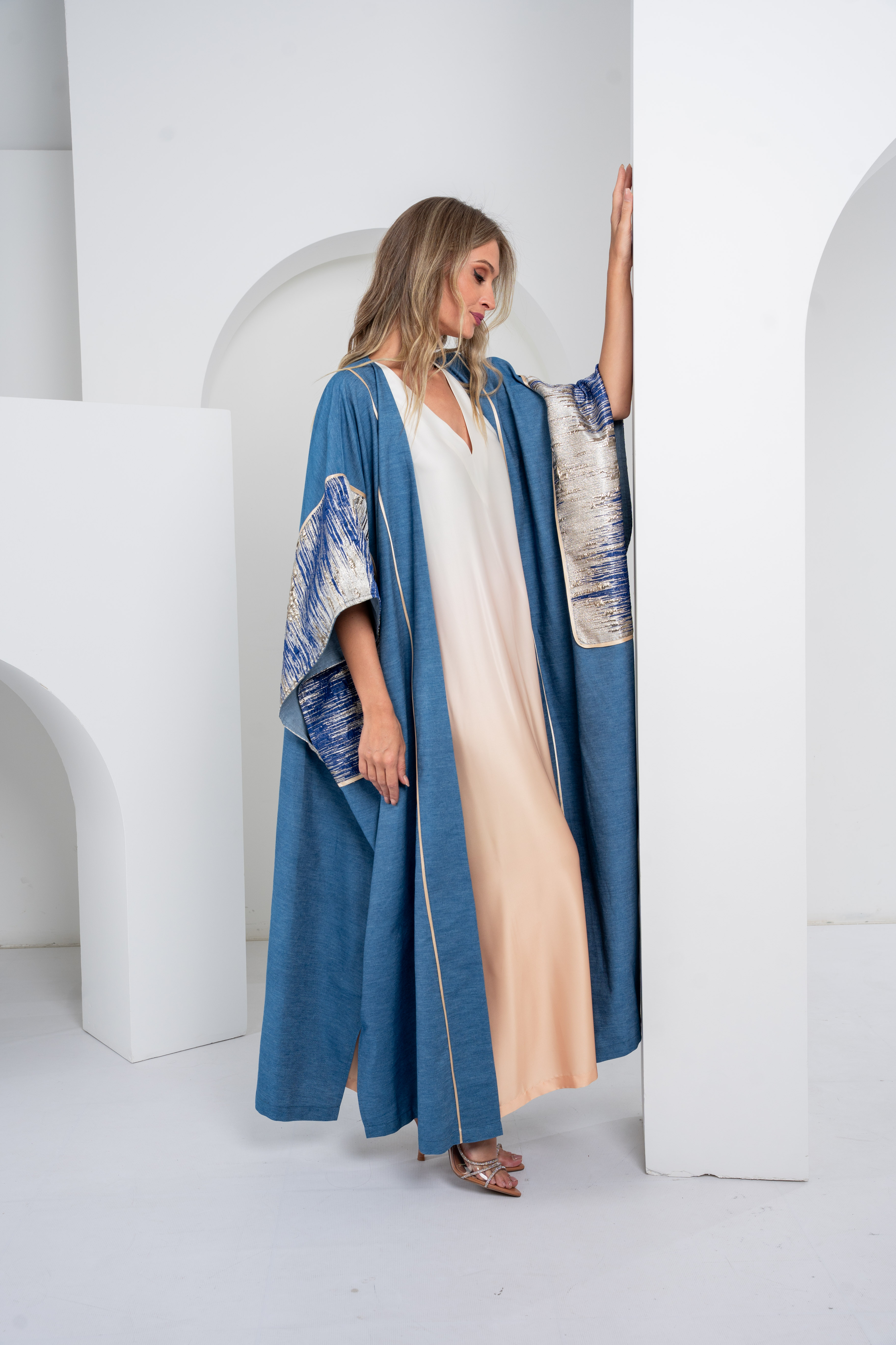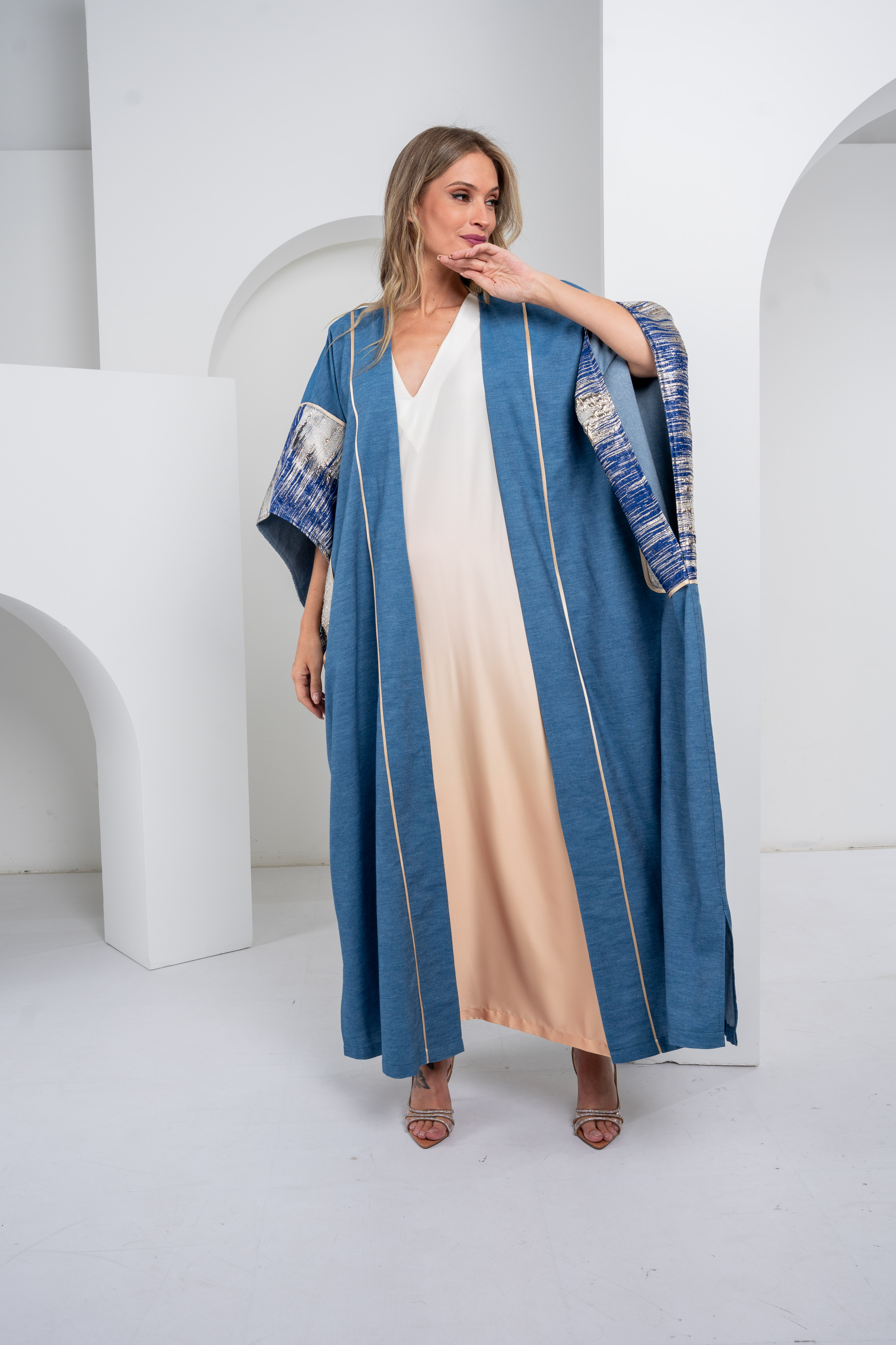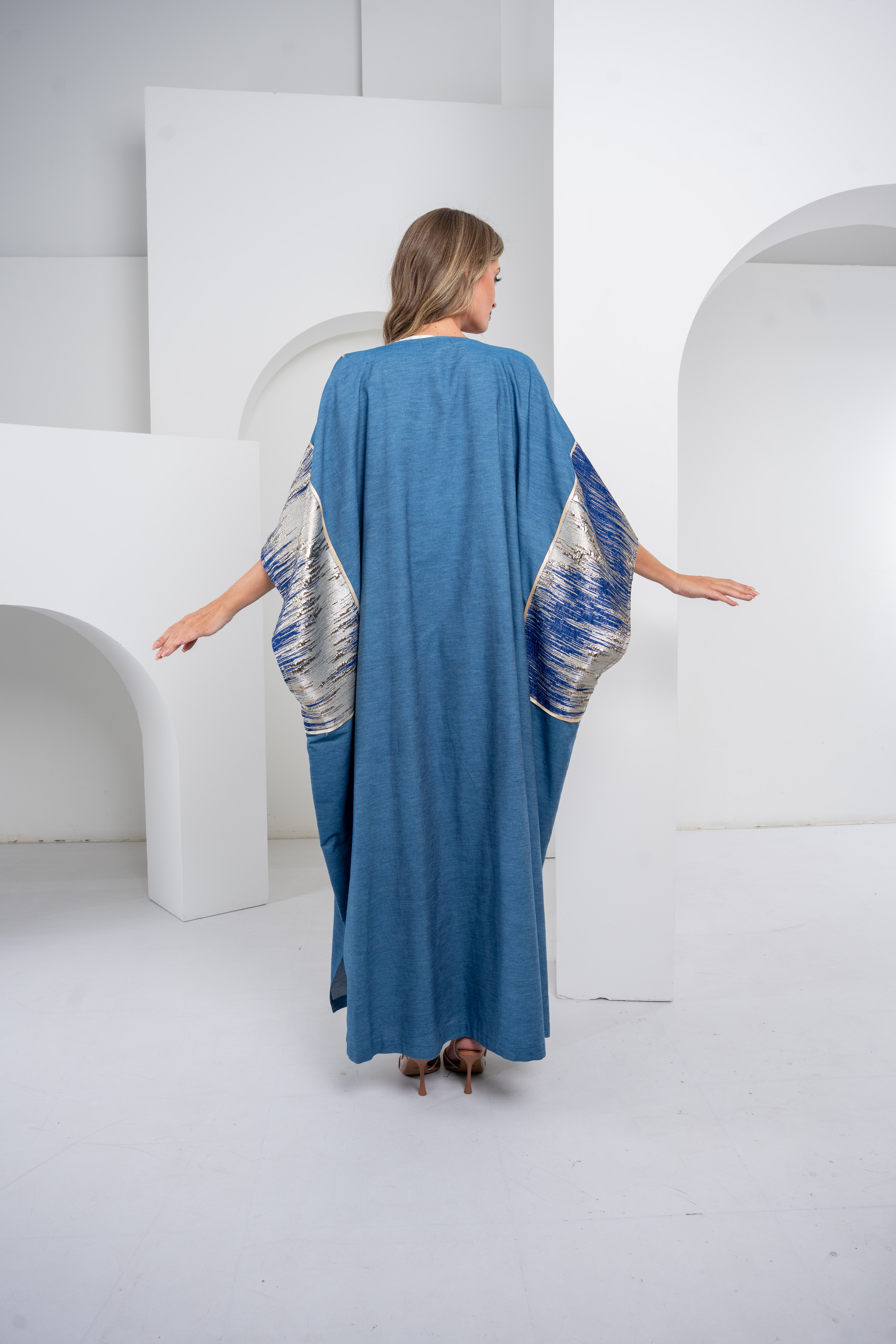 Matar Kaftan: Inspired by the rhythm of rain, this denim jacquard kaftan carries a subtle texture and effortless flow — grounded, modern, and quietly refined.