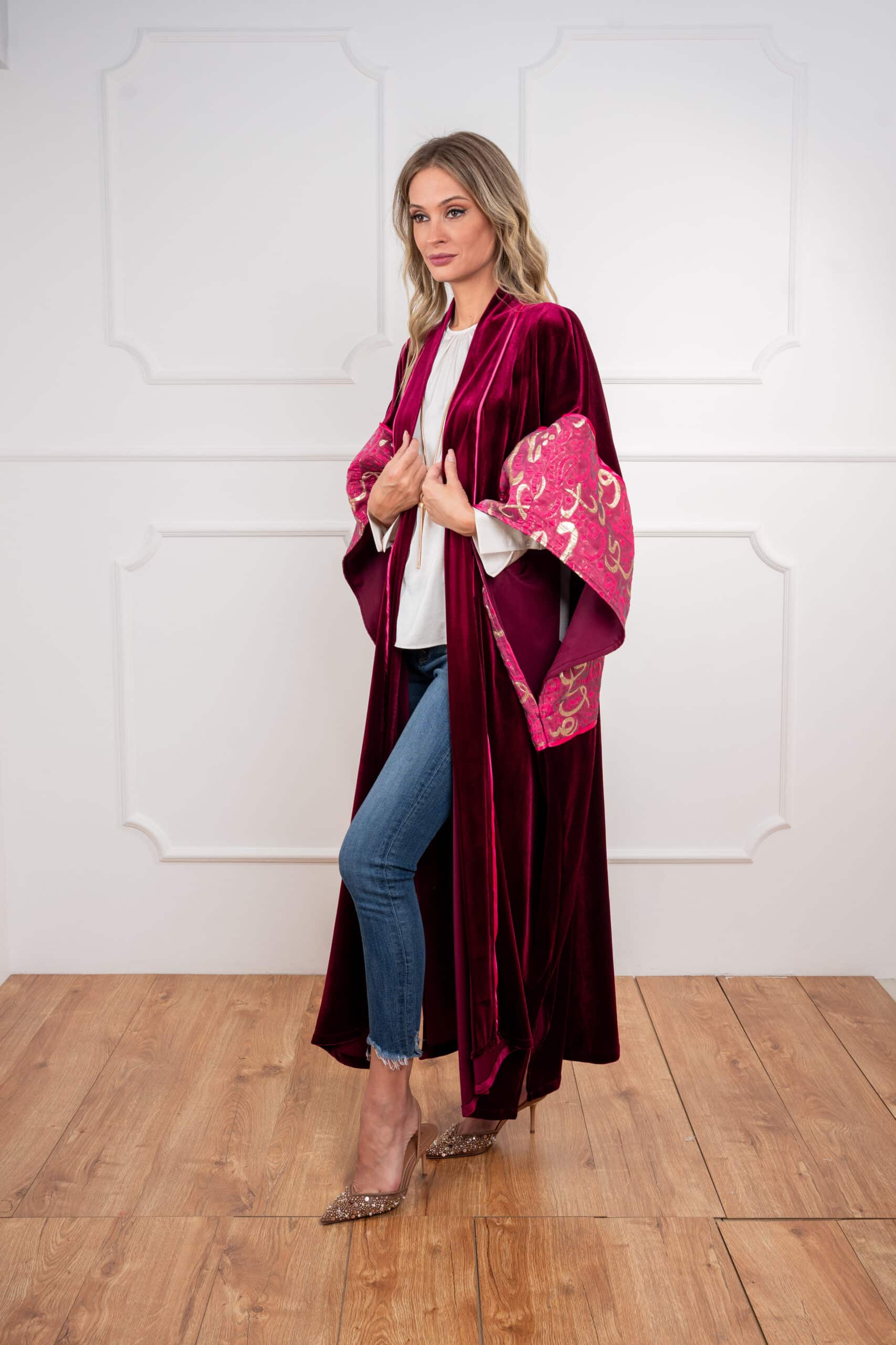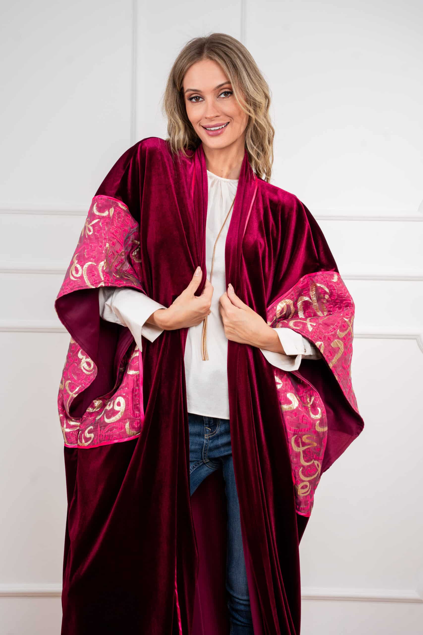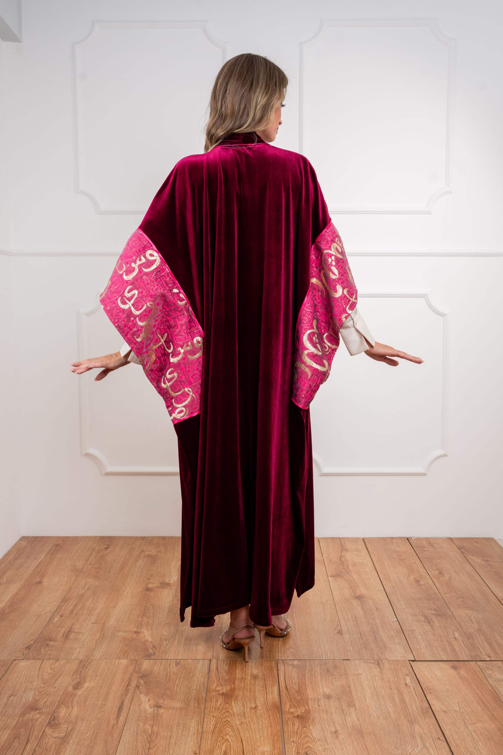 Sway Dusk: Flows with ease in a rich, luxurious drape — accented by Arabic calligraphy on the sleeves for a whisper of heritage in motion.