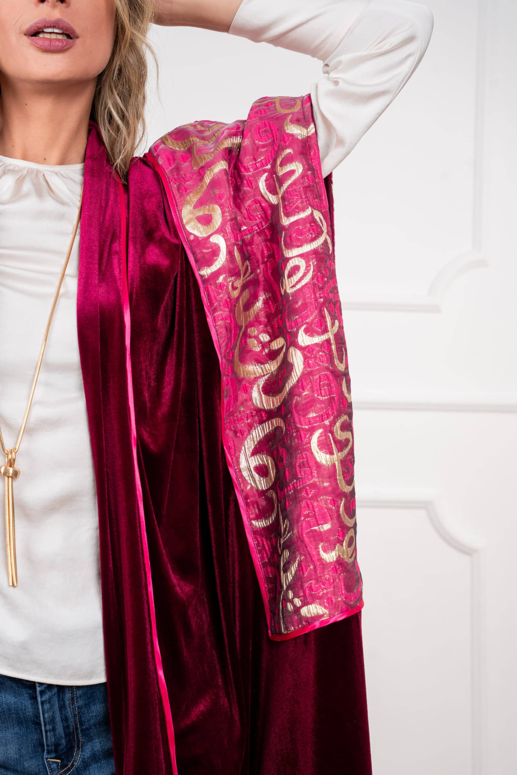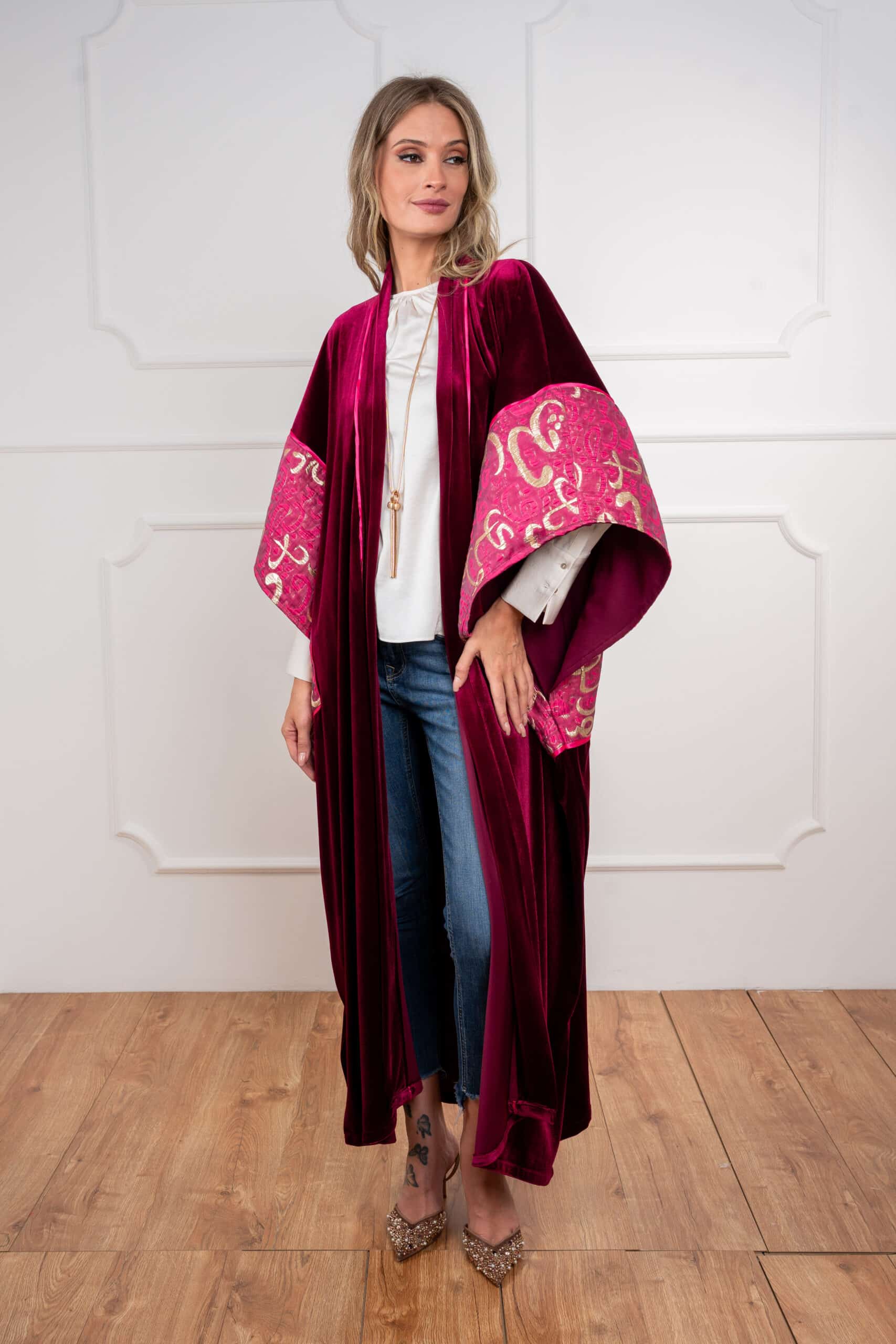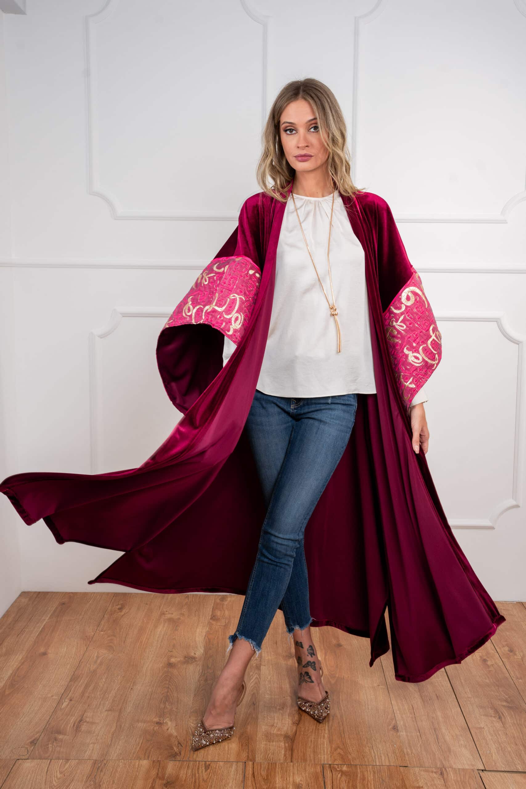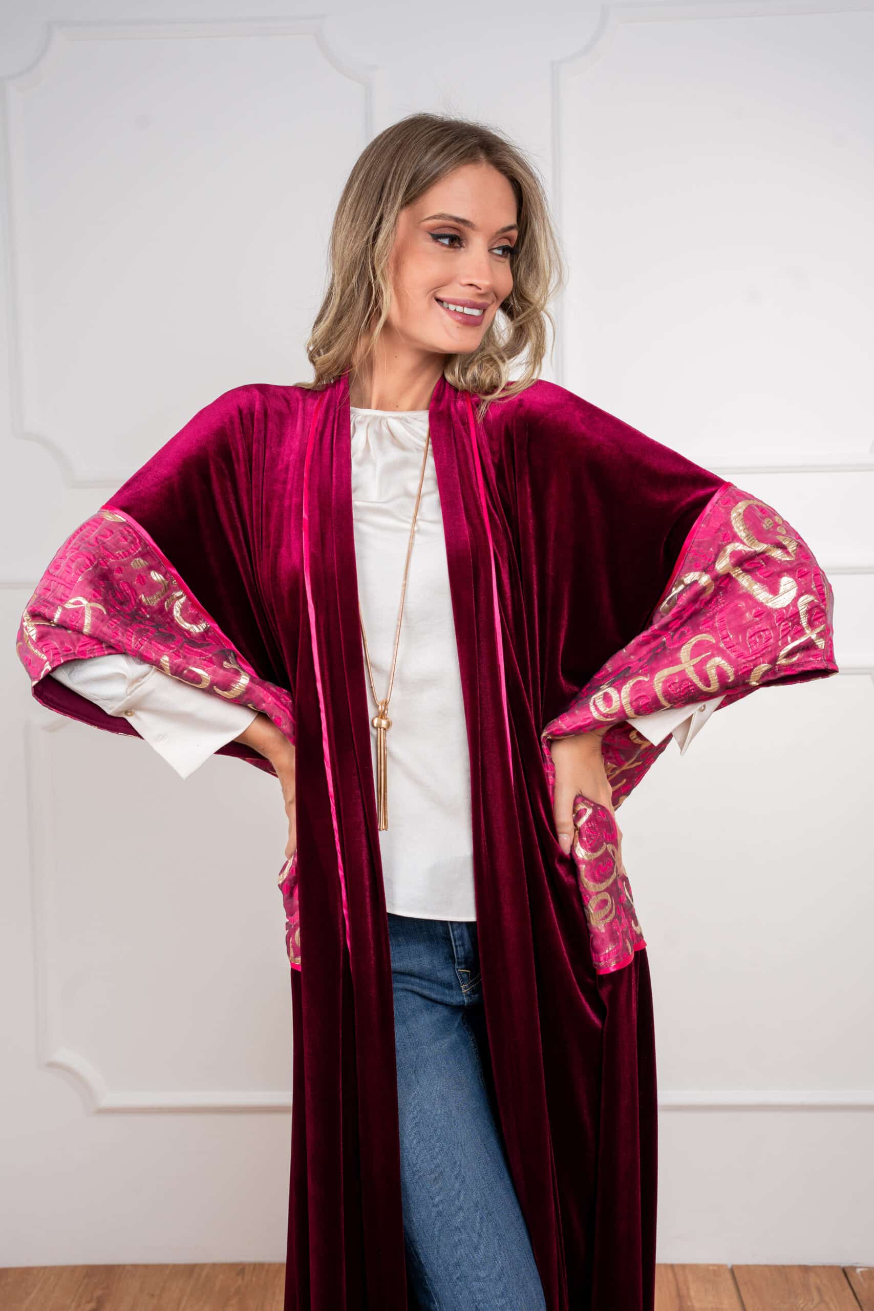 Sway Dusk: Flows with ease in a rich, luxurious drape — accented by Arabic calligraphy on the sleeves for a whisper of heritage in motion.
