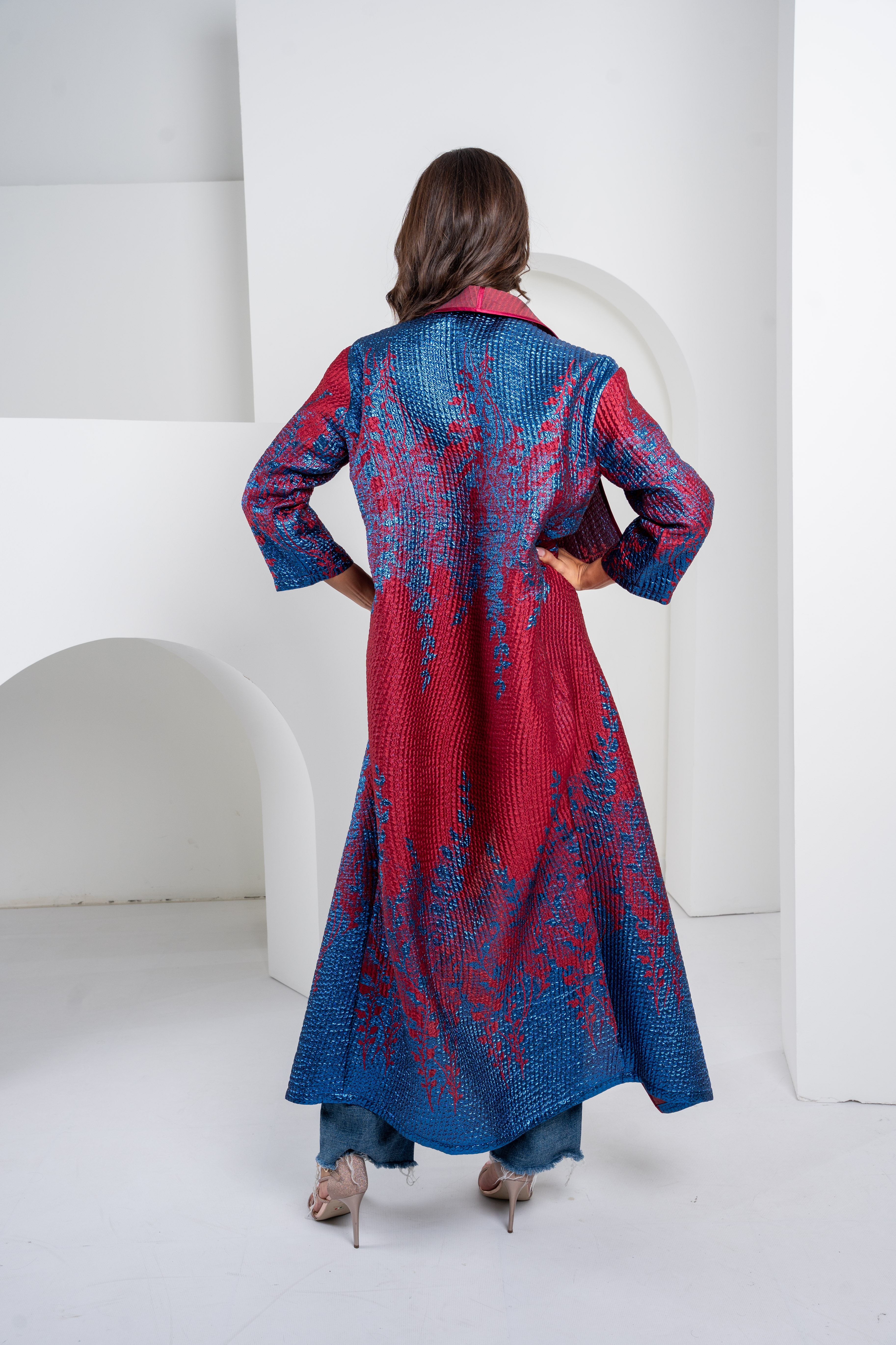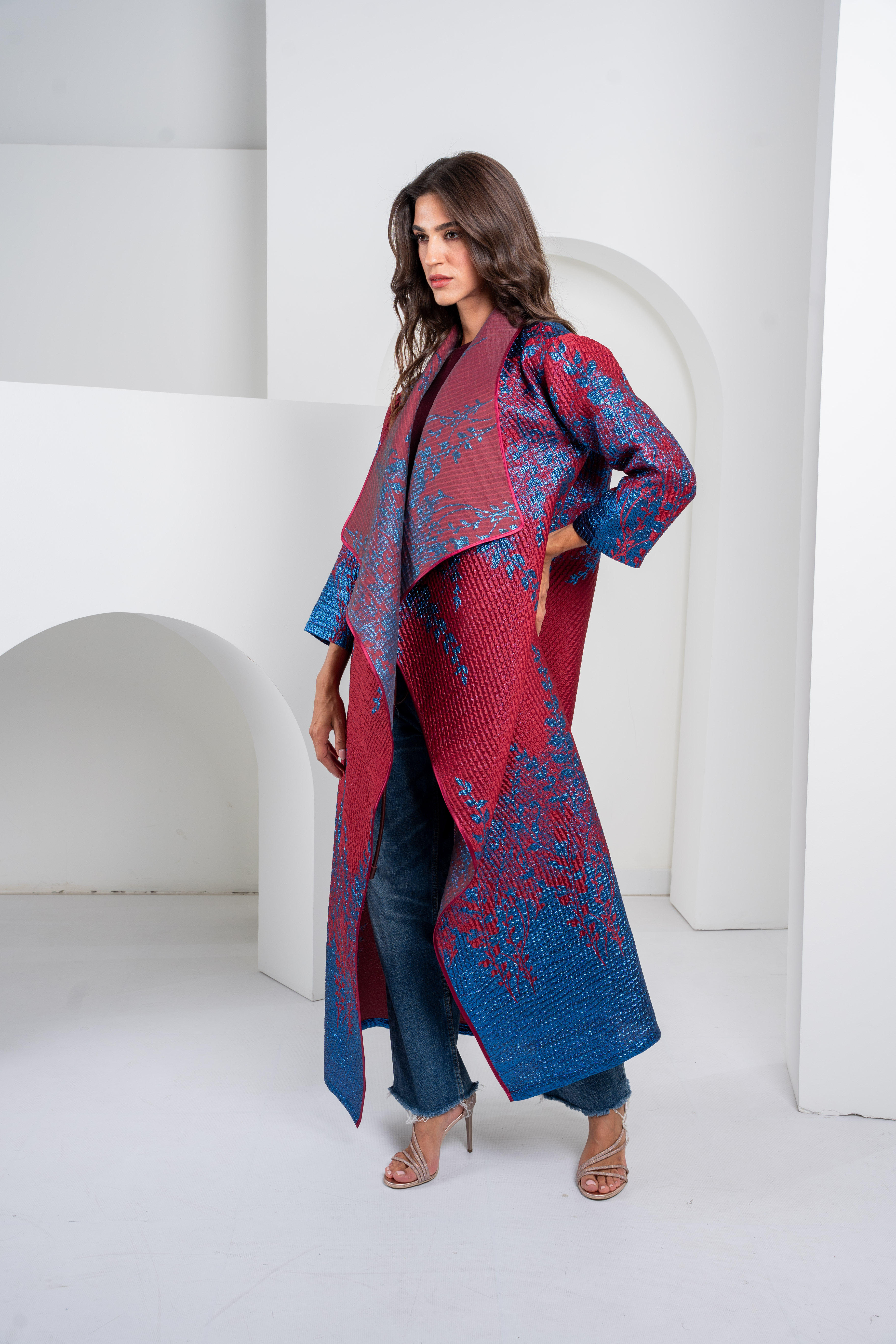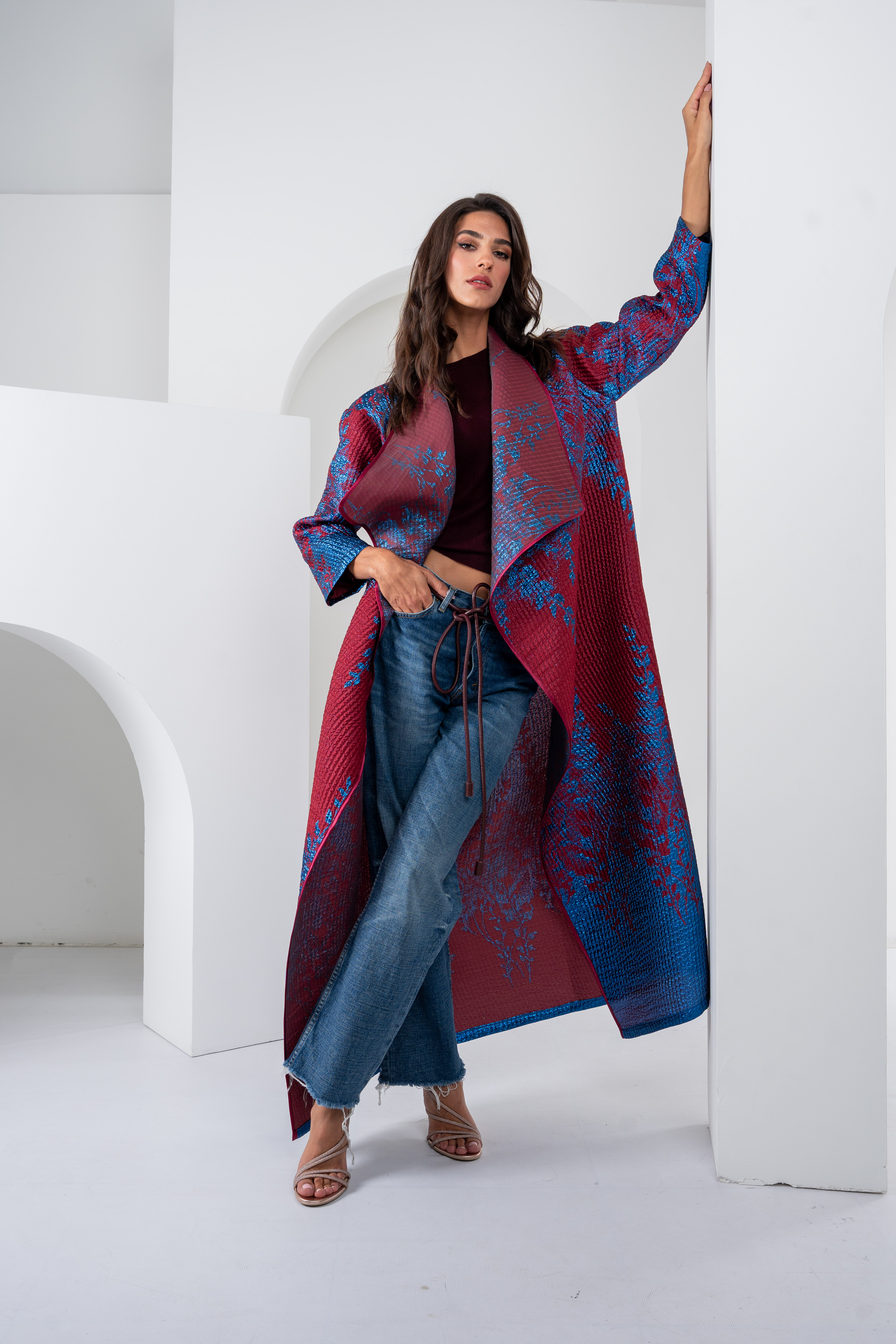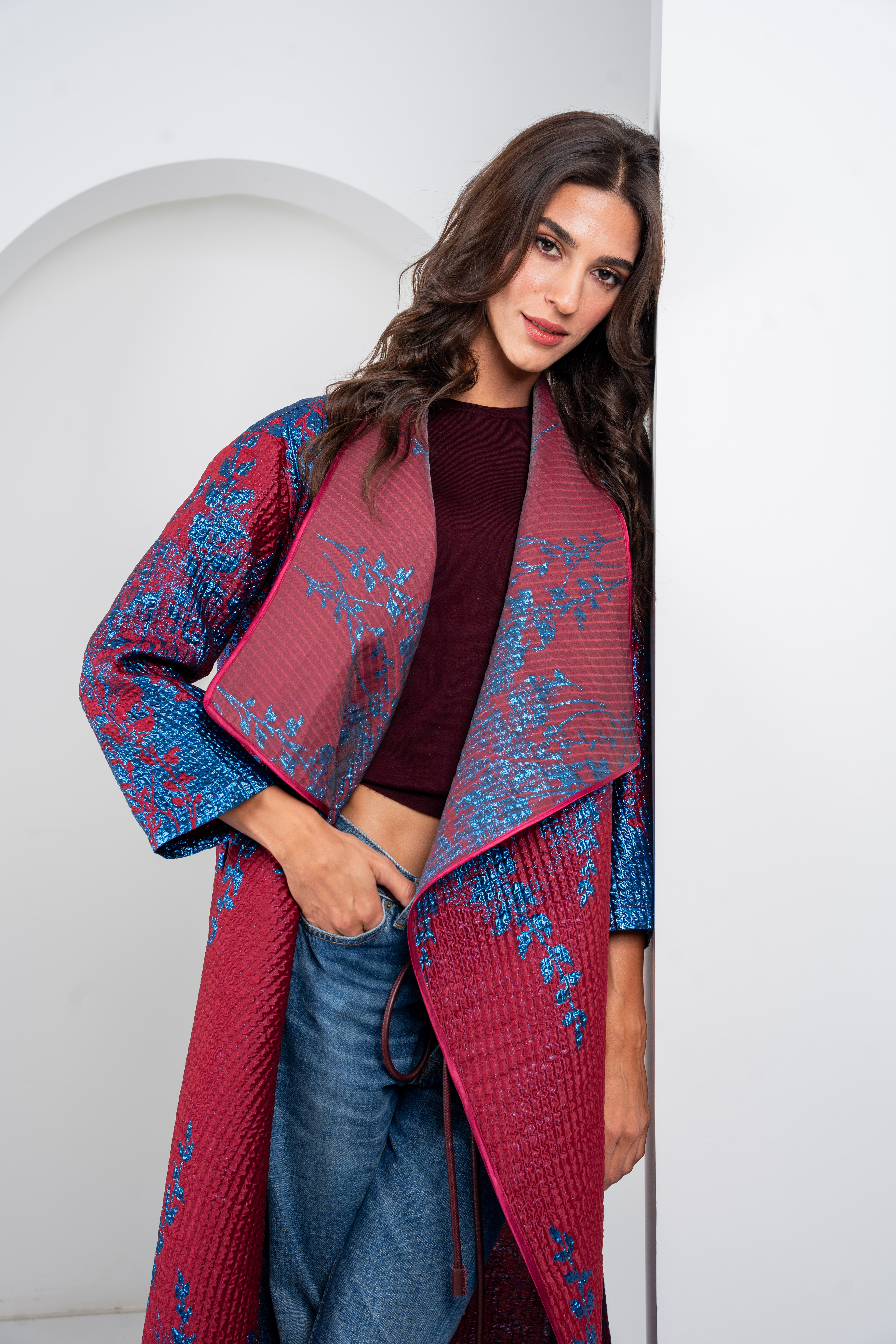 Talj Kaftan: As soft as snowfall, this cozy metallic jacquard kaftan wraps you in warmth and subtle shimmer — serene, luminous, and effortlessly refined.