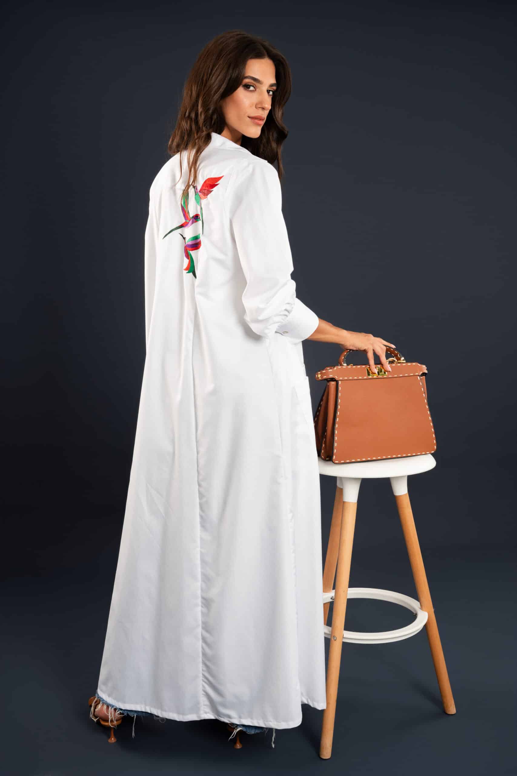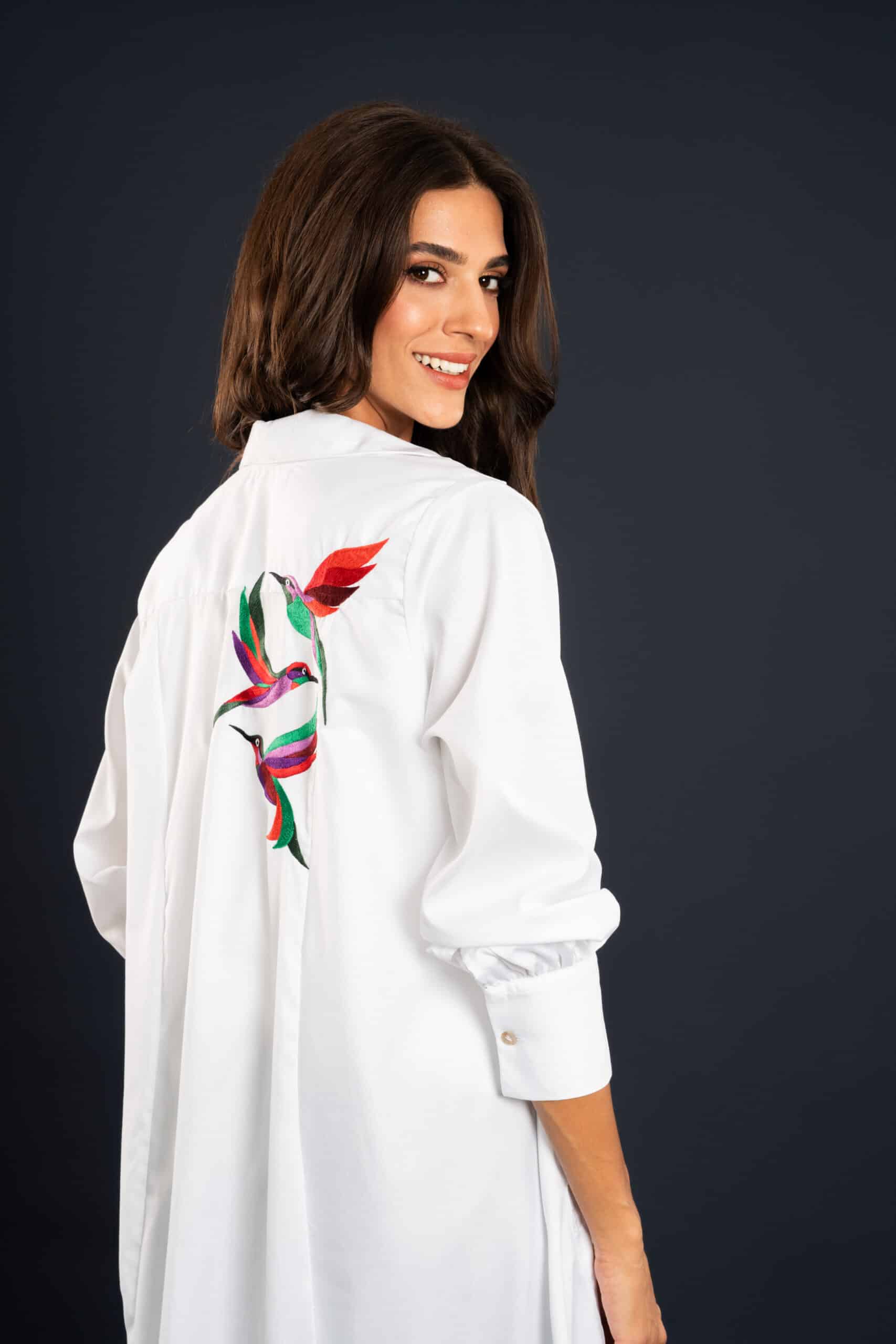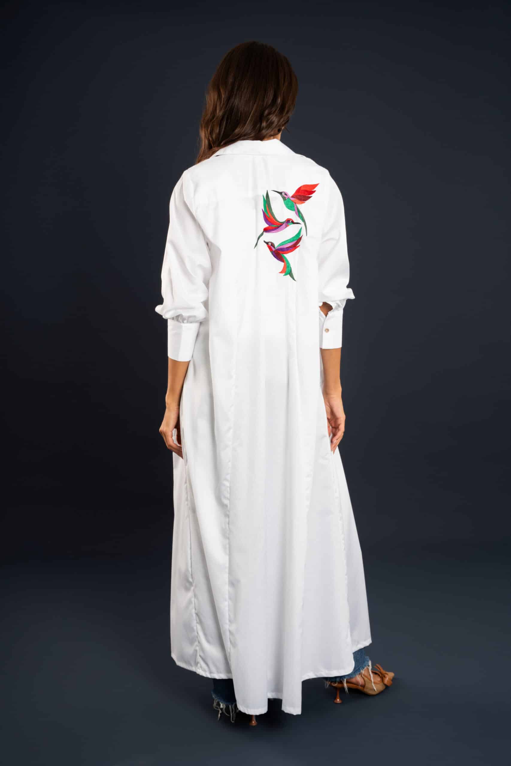 This blouse dress blends everyday ease with a touch of artistry, featuring delicate bird motifs on the back that add an unexpected statement.