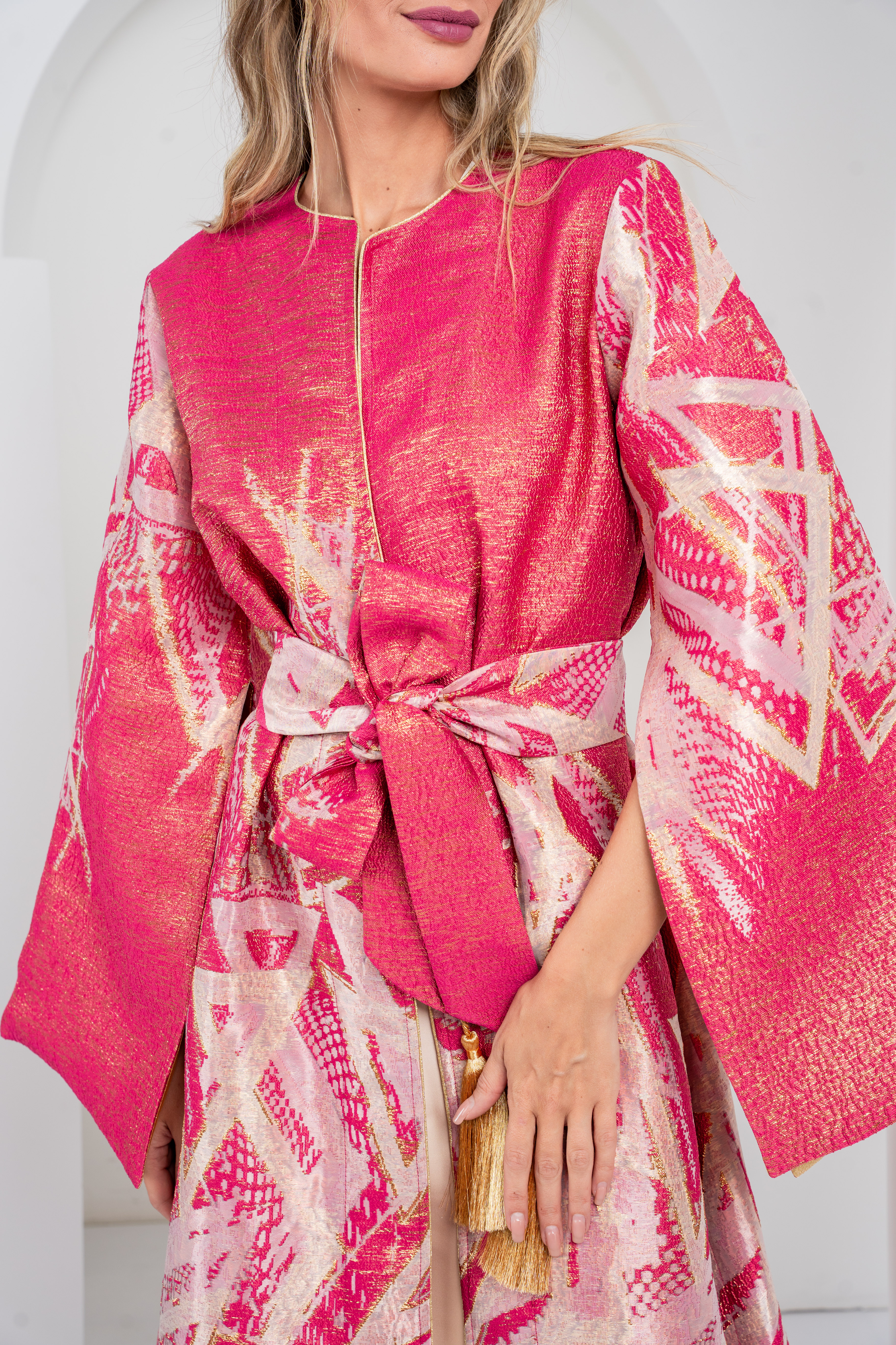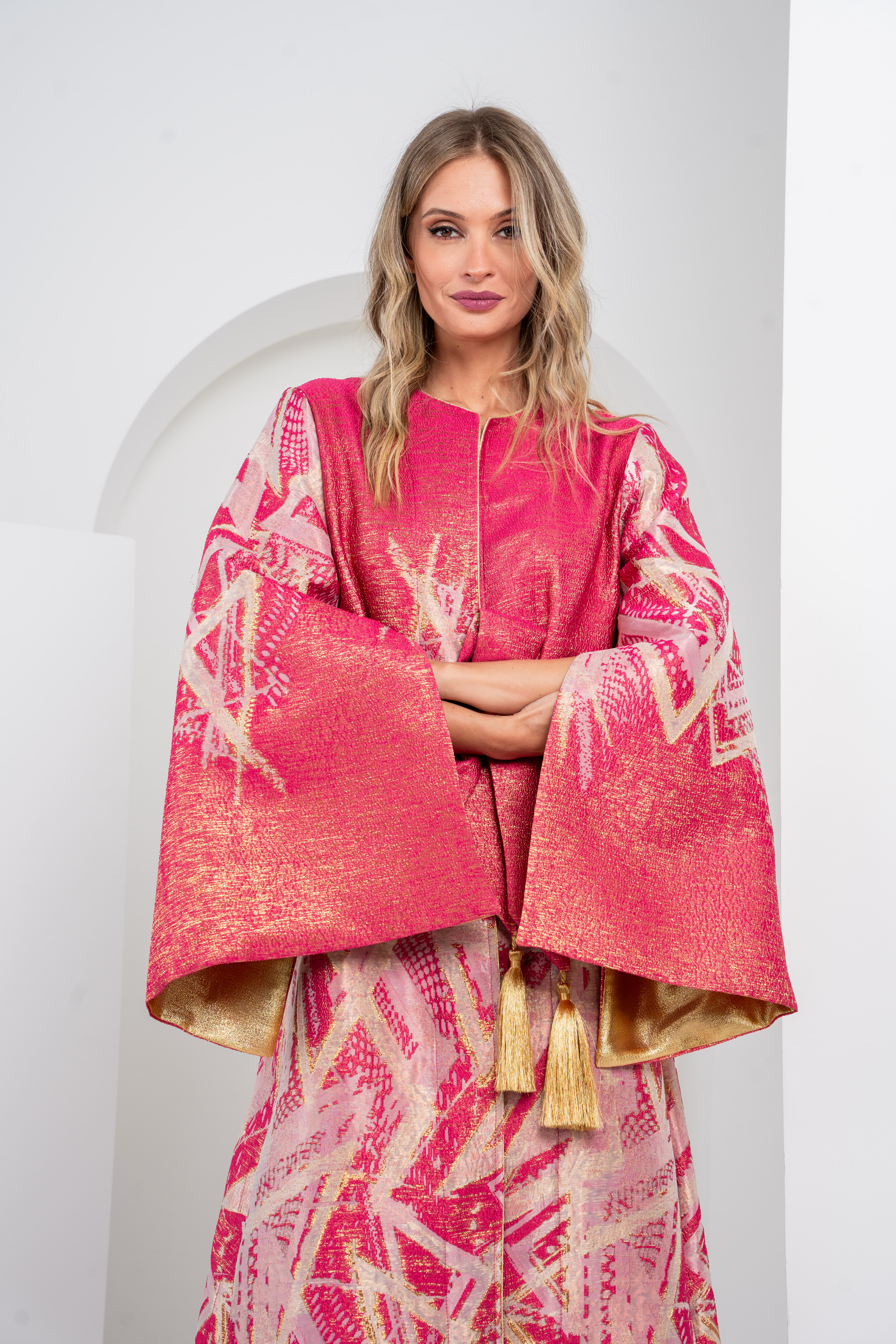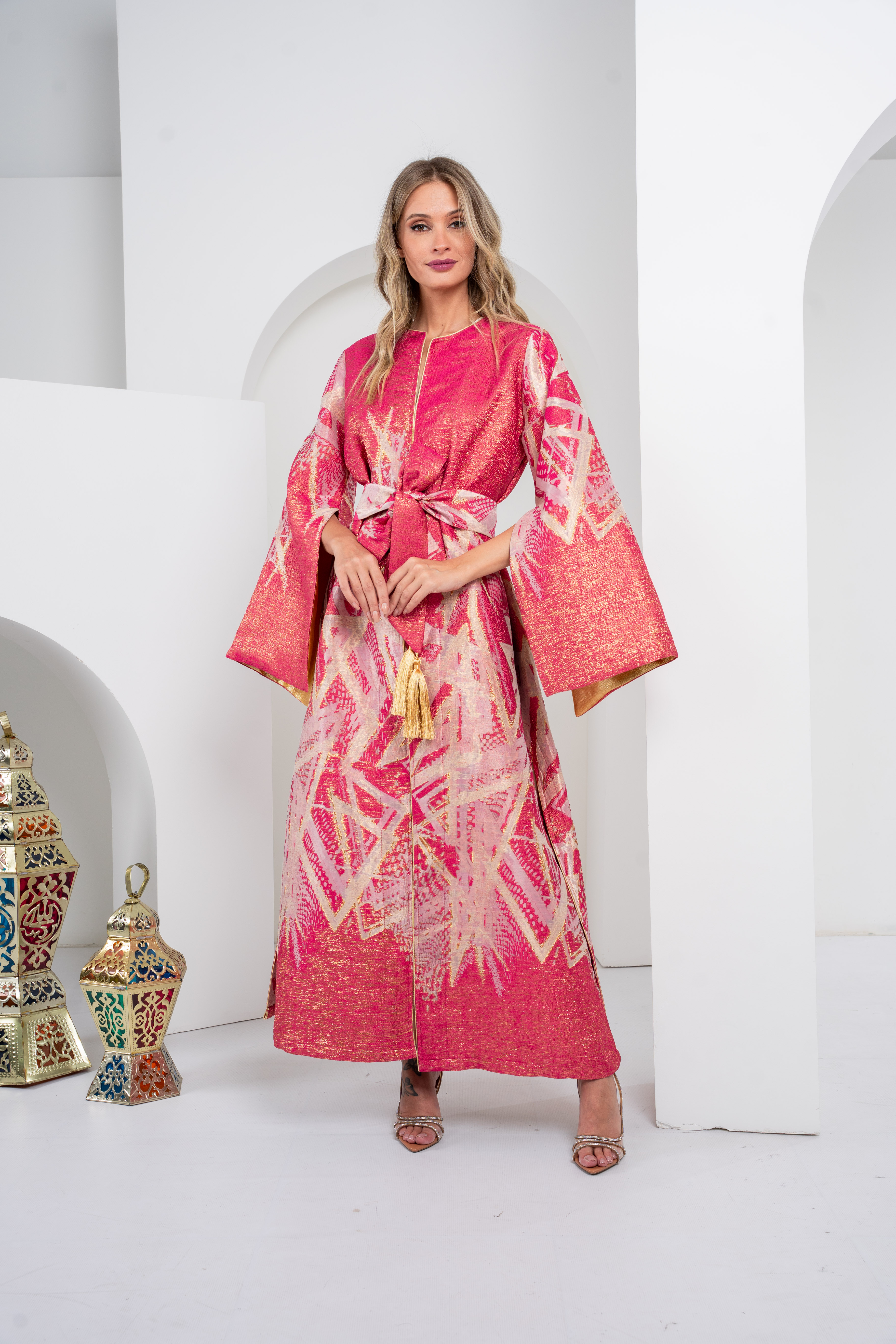 Zahran Kaftan: A bloom in motion — this fuchsia jacquard kaftan radiates bold elegance, blending vibrant energy with regal grace.