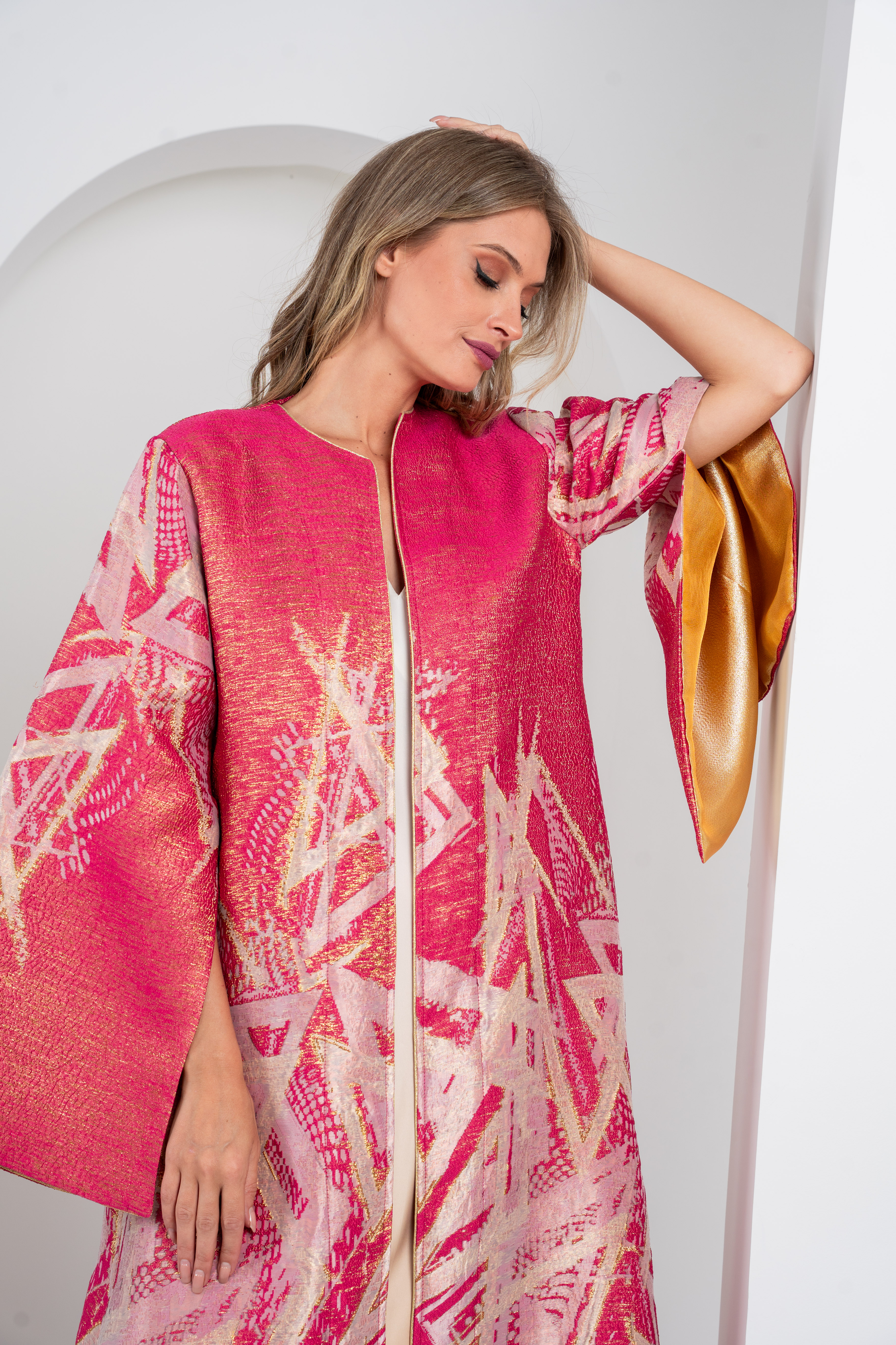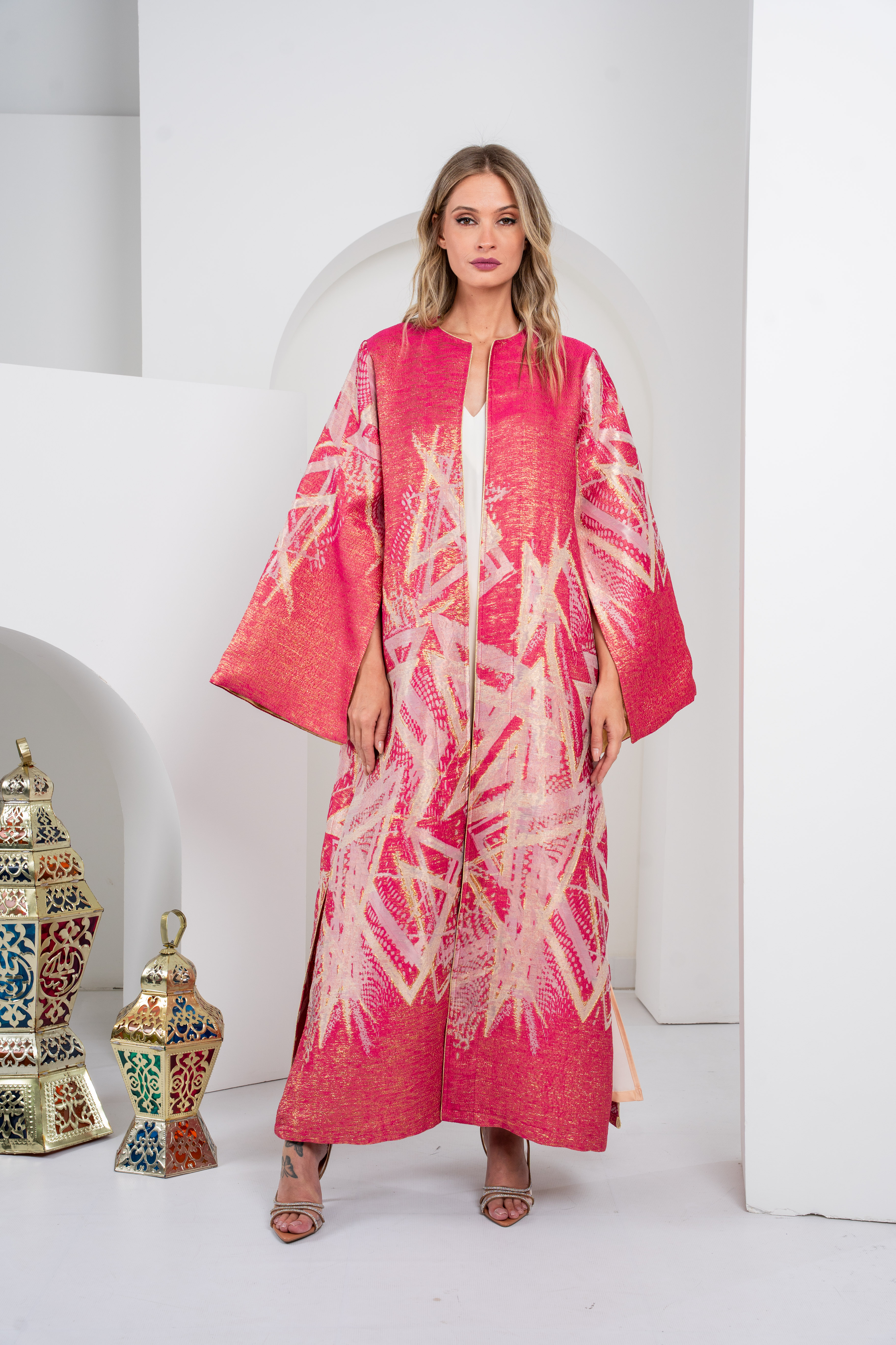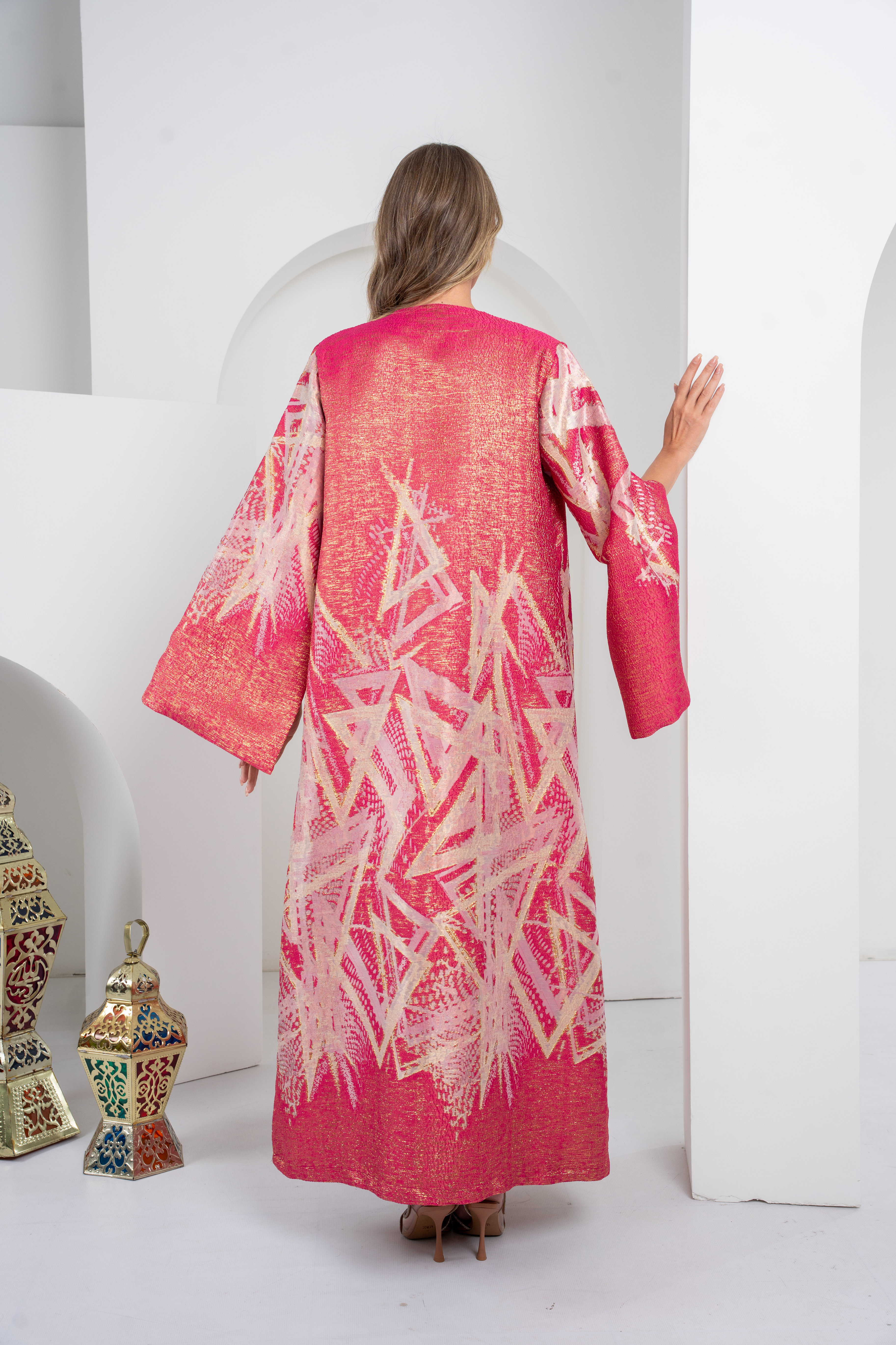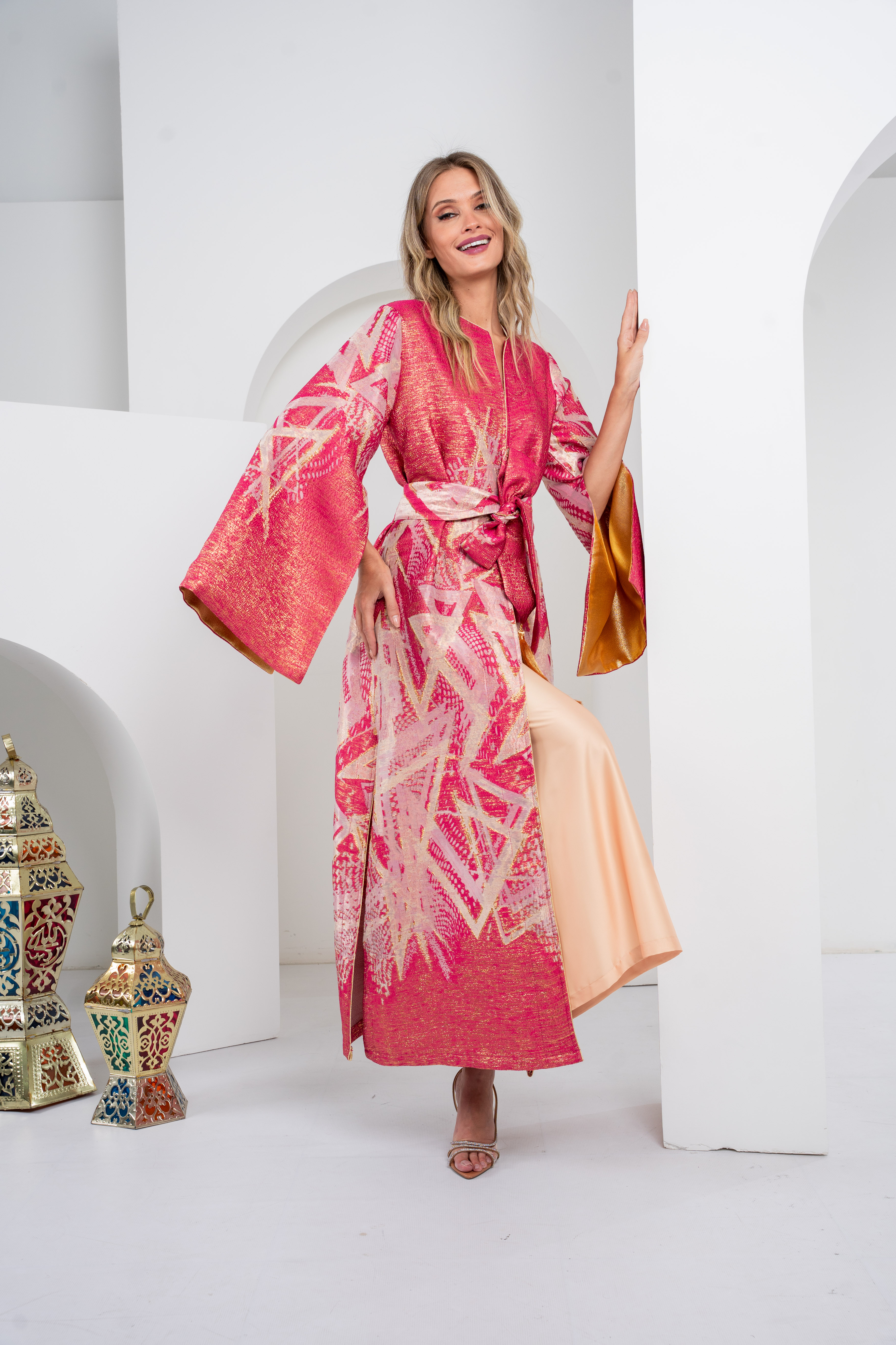 Zahran Kaftan: A bloom in motion — this fuchsia jacquard kaftan radiates bold elegance, blending vibrant energy with regal grace.